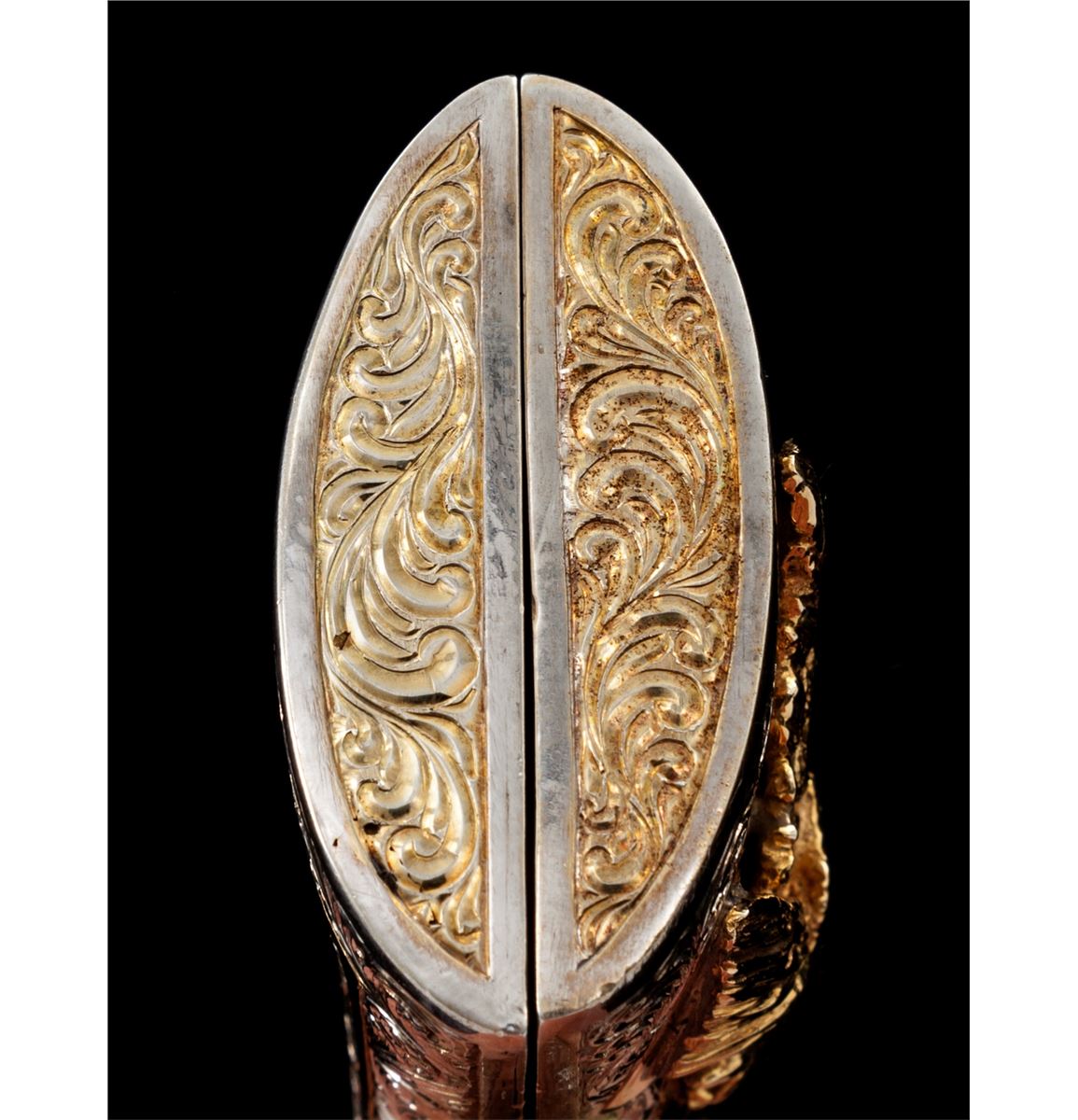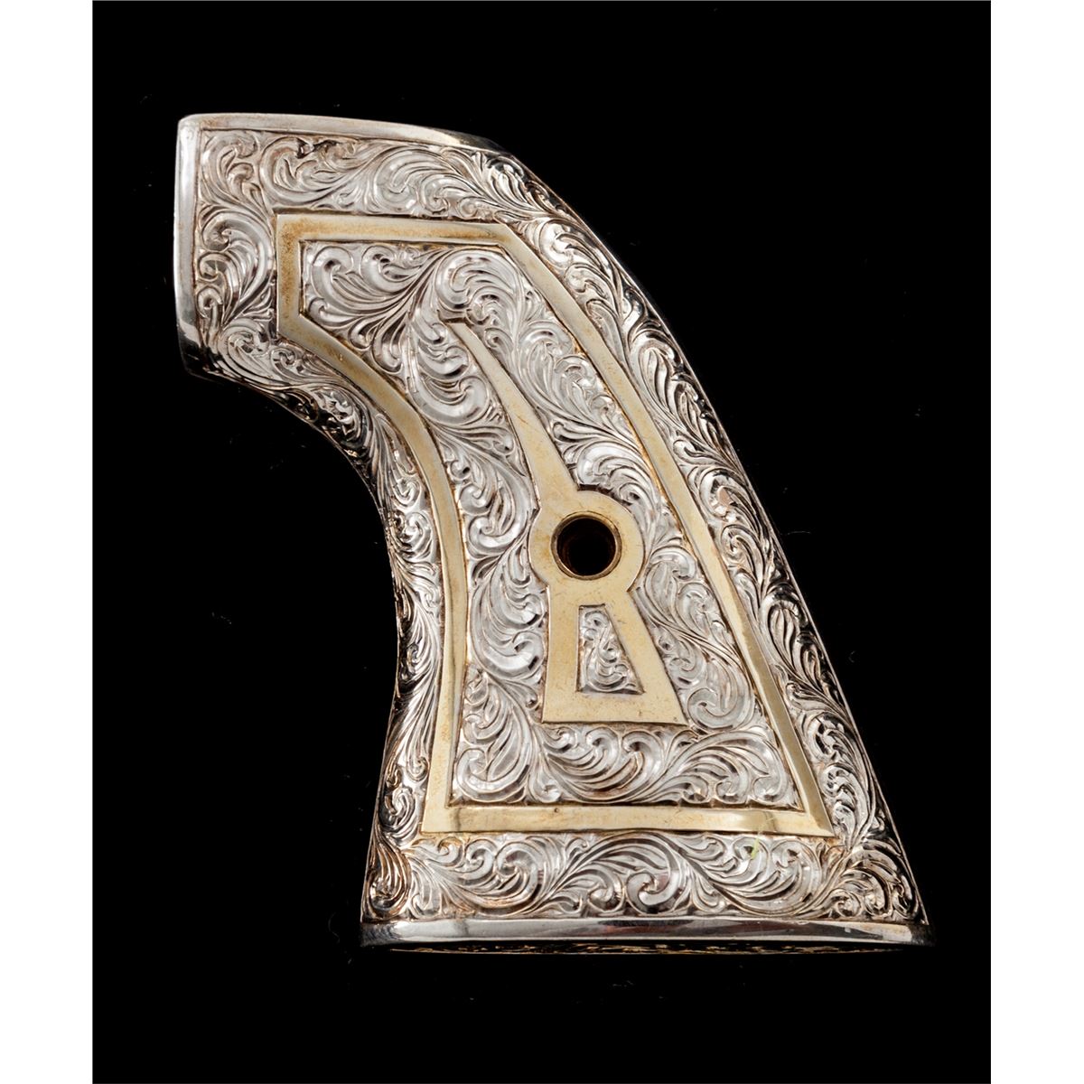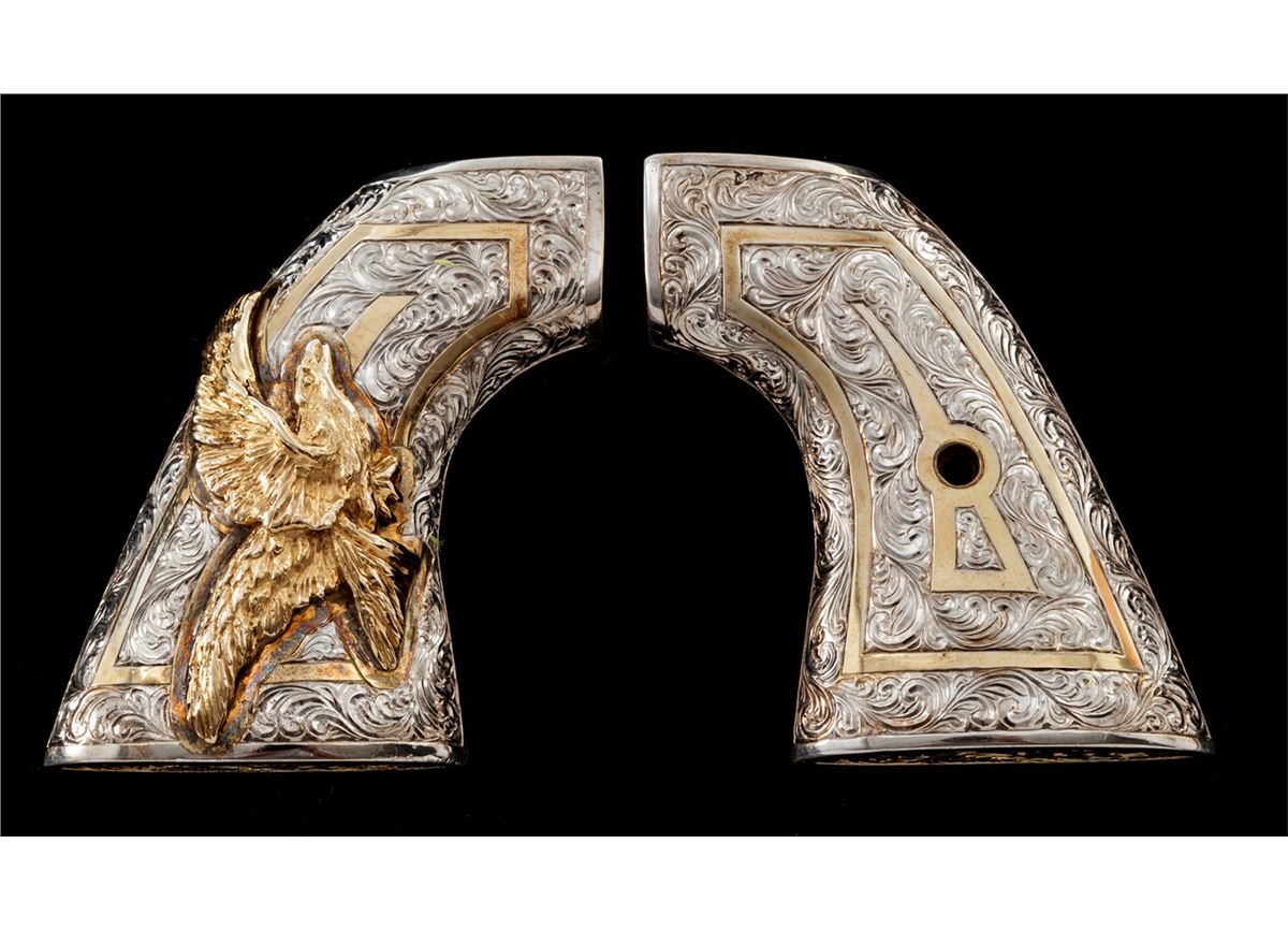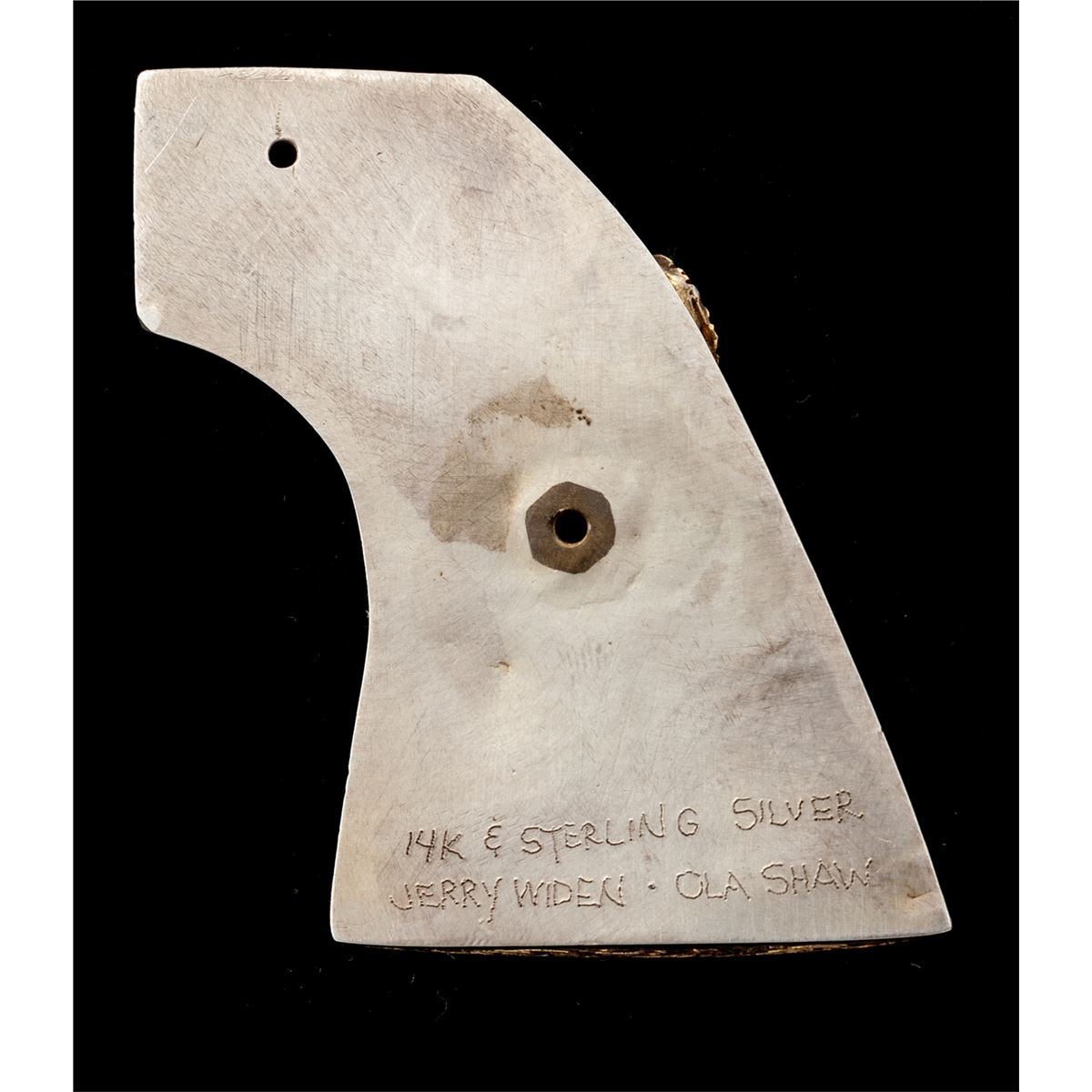14K Gold and Sterling Silver Single Action Grips, by Jerry Widen-Ola Shaw, made of heavy cast sterling silver with large gold-applied eagle to right panel. Both panels are striped and detailed with applied gold. Condition is excellent showing only light marks from handling. Grip screw not included. Est.: $1,200-$1,800.