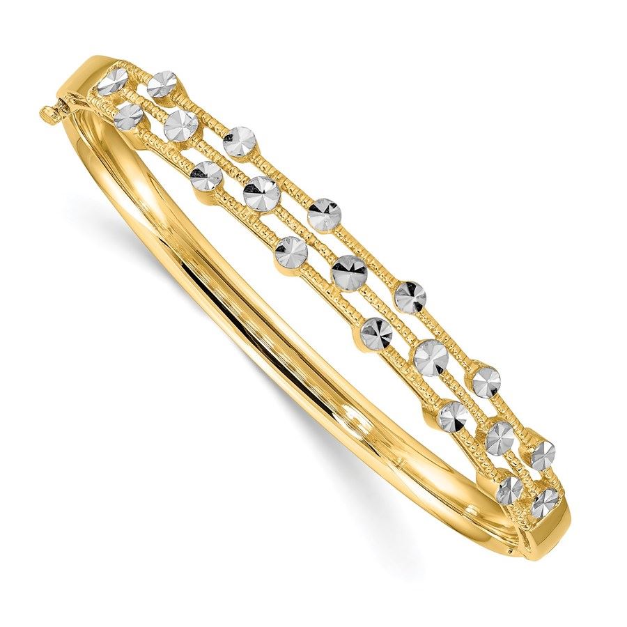 14K and White Rhodium Polished and Diamond-cut Hinged Bangle