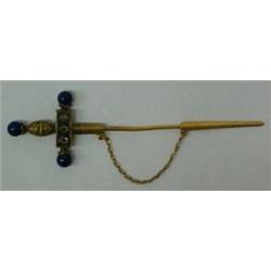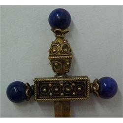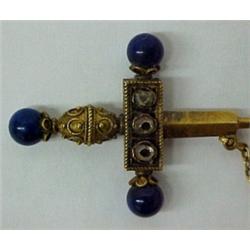14K and diamond sword pin, 3 1/2" pin with three lapis beads and three mine cut diamonds, cannetille decoration on sword handle indicates Italian workmanship, Wt. 3.3 dwt