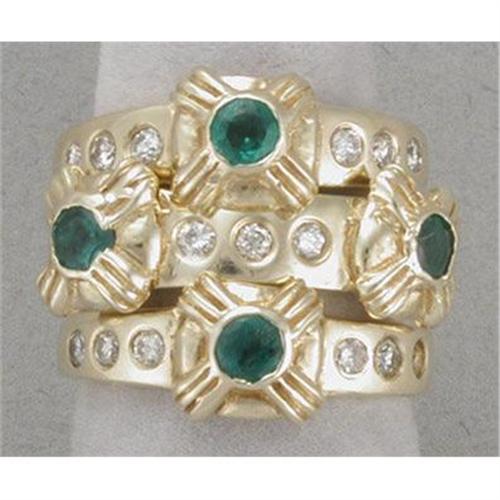 Versatile! Wear them singly or stacked together. these 14K (marked) rings are graced with a total of four 4MM emeralds and fifteen .03 carat diamonds. They are a size 6 1/4 and together they weigh 12.8 grams.