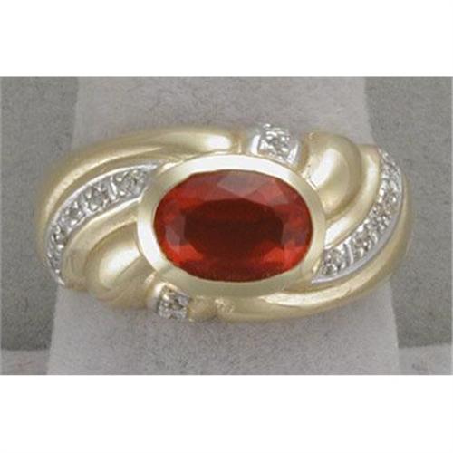 Attractive 14K yellow gold mounting has bezel-set fire opal measuring 8MM x 10MM (estimated to weigh over 1 1/2 carats). It is accented by fourteen .015 carat diamonds. It is a size 8 1/2 and weighs 6.4 grams.