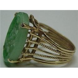 14K gold and jade ring, custom yellow gold mounting with carved jade, approximately 7/8" long, bird motif, wt. 5.6 dwt/8.7 g Estimate 140/220