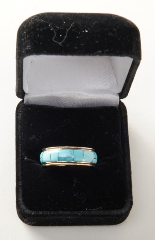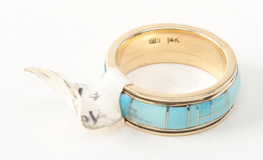 14K gold band mounted with fine turquoise showing makers signature and quality workmanship. Approximately size 7 and cannot be resized. New Mexico dealer’s tag for $1775 still attached. Est.: $300-$600