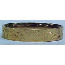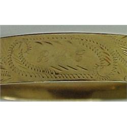 14K gold hinged bangle bracelet, measures approximately 1/2" wide and has engraved decoration with initials R.A.C., bracelet has two small dents on back and very light surface scratching, Wt 9.9 dwt.