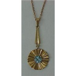 14K gold pendant and chain, retro style pendant, 1 1/2" long with round blue topaz, 18" link chain, Wt. 2.3 dwt
