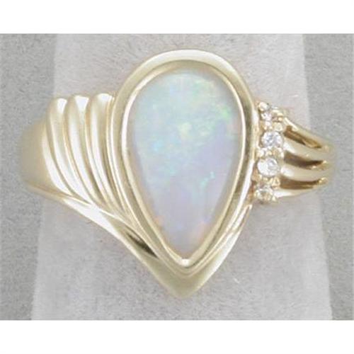 Sleek and contemporary: 14K (marked "OJ" 14K) ring set with a nice pear-shaped opal measuring 7.5MM x 15MM. The opal (mounting is open in the back of the stone) shows purples, reds, greens and a little yellow. It is accented by three .03 carat diamonds. It is a size 7 1/2 and wighs 4.8 grams.
