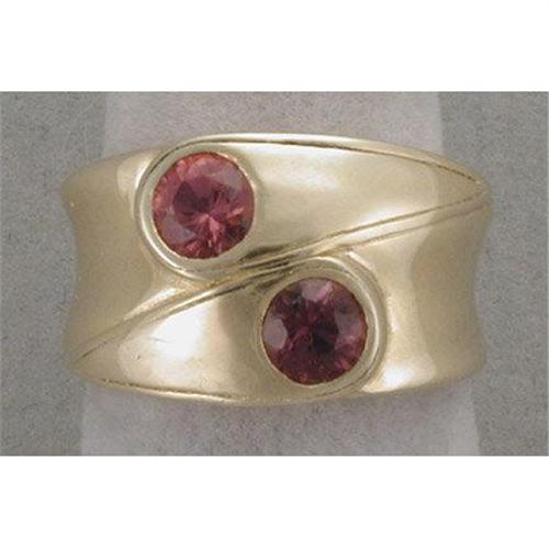 Fun 14K contemporary tapered band (11 1/2MM at the widest point, on top of ring) set with two approximately 5.75MM pink tourmalines (estimated to total over 1 1/2 carats in weight). It is a size 7 and weighs 9.8 grams.