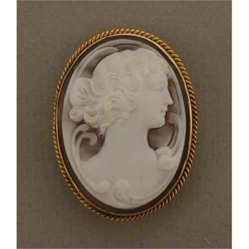 Beautifully detailed shell cameo of lady's profile is set in 14K (unmarked, but tested) and measures 30 x 42MM and weighs 13.6 grams.