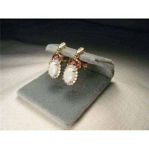 You are looking at a pair of estate 14K two-tone gold opal pink tourmaline and diamond drop earrings. Each earring features one oval opal measuring 8 mm by 6 mm, 2 marquise shaped pink tourmalines measuring 5 mm by 3 mm, and 18 brilliant round diamonds measuring 2 mm in diameter each. The total weight of the diamonds is .47 of a carat. All gemstones are natural. Each earring measures 7/8 of an inch long by 3/8 of an inch wide. The pair weighs 3.7 grams. They are in mint condition.