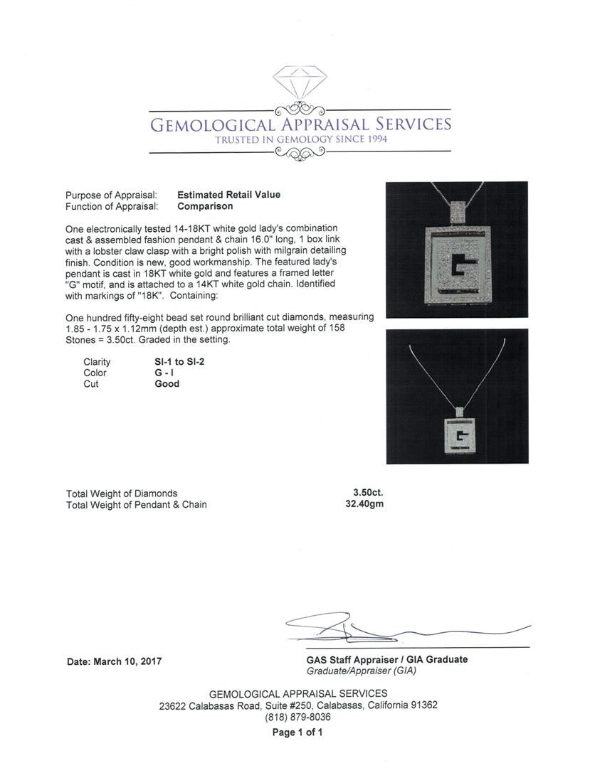 One electronically tested 14-18KT white gold lady's combination cast & assembled fashion pendant & chain 16.0" long, 1 box link with a lobster claw clasp with a bright polish with milgrain detailing finish. The featured lady's pendant is cast in 18KT white gold and features a framed letter "G" motif, and is attached to a 14KT white gold chain. Identified with markings of "18K". Condition is new, good workmanship. Containing: One Hundred Fifty-Eight bead set round brilliant cut diamonds, measuring 1.85 - 1.75 x 1.12mm (depth est.) approximate total weight of 158 Stones = 3.50ct. Graded in the setting. Color G - I Clarity SI-1 to SI-2 Cut Good. Total Weight of Diamonds 3.50ct. Total Weight of Pendant & Chain 32.40gm. GAS Appraised.