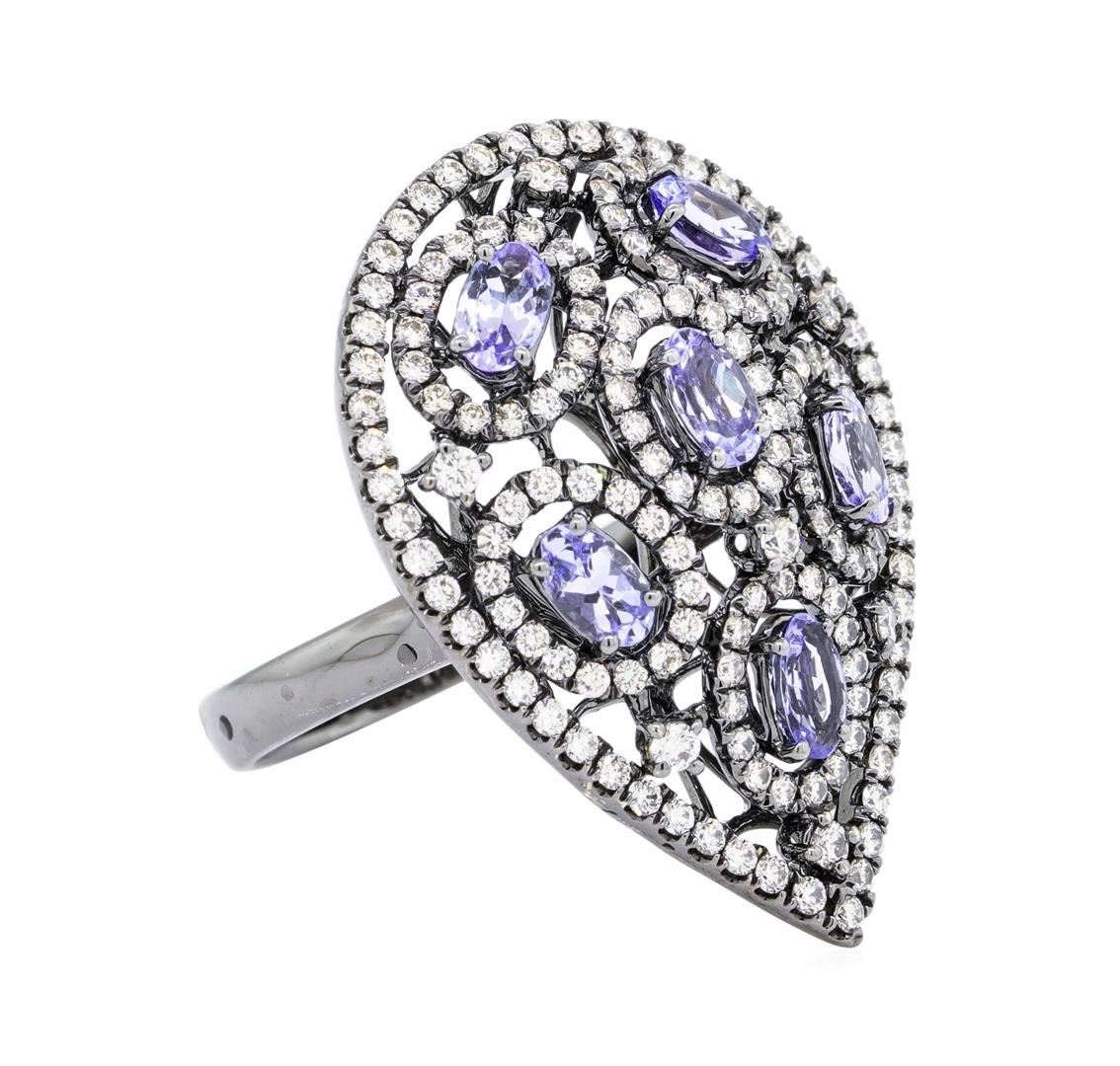 One electronically tested 14KT black rhodium gold lady's cast fashion cocktail ring with a bright polish finish. The featured lady's ring has a shank measuring 2.95 millimeters wide. Identified with markings of '14K'. Condition is new, good workmanship. Containing: Six prong set oval modified mixed cut natural tanzanites, measuring 5.20 x 3.00 x 2.00mm, (depth est.) approximate total weight of 1.32ct., clarity is eye clean, medium light, very slightly grayish, violetish blue color, (GIA vB 4/3), cut is good. Graded in the setting. Seven prong set round brilliant cut diamonds, measuring 1.70 - 1.60 x 1.02mm (depth est.) approximate total weight of 7 Stones = 0.12ct. Graded in the setting. Color H - I Clarity VS-2 to SI-1 Cut Very Good One Hundred Forty-Nine prong set round brilliant cut diamonds, measuring 1.40 - 1.30 x 0.84mm (depth est.) approximate total weight of 149 Stones = 1.40ct. Graded in the setting. Color H - I Clarity VS-2 to SI-1 Cut Very Good. Total Weight of Colored Stones 1.32ct.. Total Weight of Diamonds 1.52ct.. Total Weight of Ring 9.50gm. GAS Appraised.