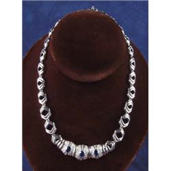 Lot 138 14KT DIAMOND AND SAPPHIRE NECKLACE Outstanding 14kt. white gold necklace is comprised of graduated size double diamond links with the bottom of the necklace set with 3 deep blue oval sapphires (2.97ct. TW) which are in turn surrounded by rows of pavee set diamonds. Total diamond weight is 1.25ct. Size 16” l. CONDITION: Very good to excellent. 5-70904