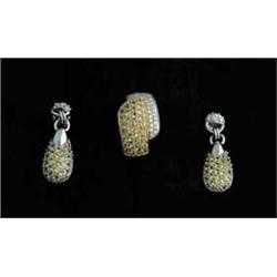 Lot 19 14KT DIAMOND & YELLOW SAPPHIRE RING & EARRINGS. 14kt gold ring is in a crisscross design, one side set with pave diamonds and the otherside with pave yellow sapphires. Matching drop earrings are teardrop shape is set with pave yellow sapphires on the bottom and diamonds at the top. Diamond total weight approx. .50ct, yellow sapphire total weight is approx. 2.37ct. CONDITION: Very good to excellent. 5-69422 (400-600)