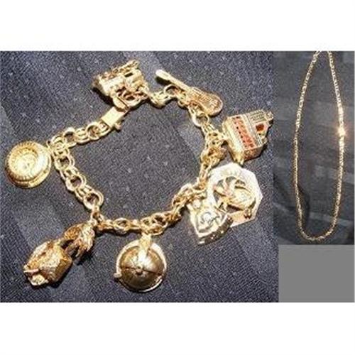 ESTIMATED OVER 40 GRAMS OF GOLD! THE DOUBLE LINK CHARM BRACELET MEASURES 7 1/4" LONG AND THE 14KT GOLD NECKLACE MEASURES 20" LONG. THERE ARE EIGHT CHARMS ON BRACLET; ONE IS THE THREE RIVERS STADIUM PITTSBURGH THAT OPENED JULY 16TH 1970. THE PIRATES HELD THEIR LAST GAME EVER AT THE THREE RIVERS STADIUM AGAINST THE CHICAGO CUBS ON OCTOBER 1, 2000 WHEN THEY LOST 10-3. ANOTHER VERY NEAT CHARM IS THE MONONGAHELA INCLINE RIDE IN PITTSBURGH THAT OPENED IN 1870! THERE IS ALSO A VIOLIN, ST. THOMAS CHARM, PALM TREE, RELIGIOUS CHARM, ONE THAT IS ROUND AND MECHANICAL, AND A TRAIN. THE NECKLACE HAS THE SAME ROUND LINKS AS THE CHARM BRACELET.