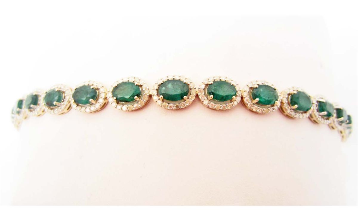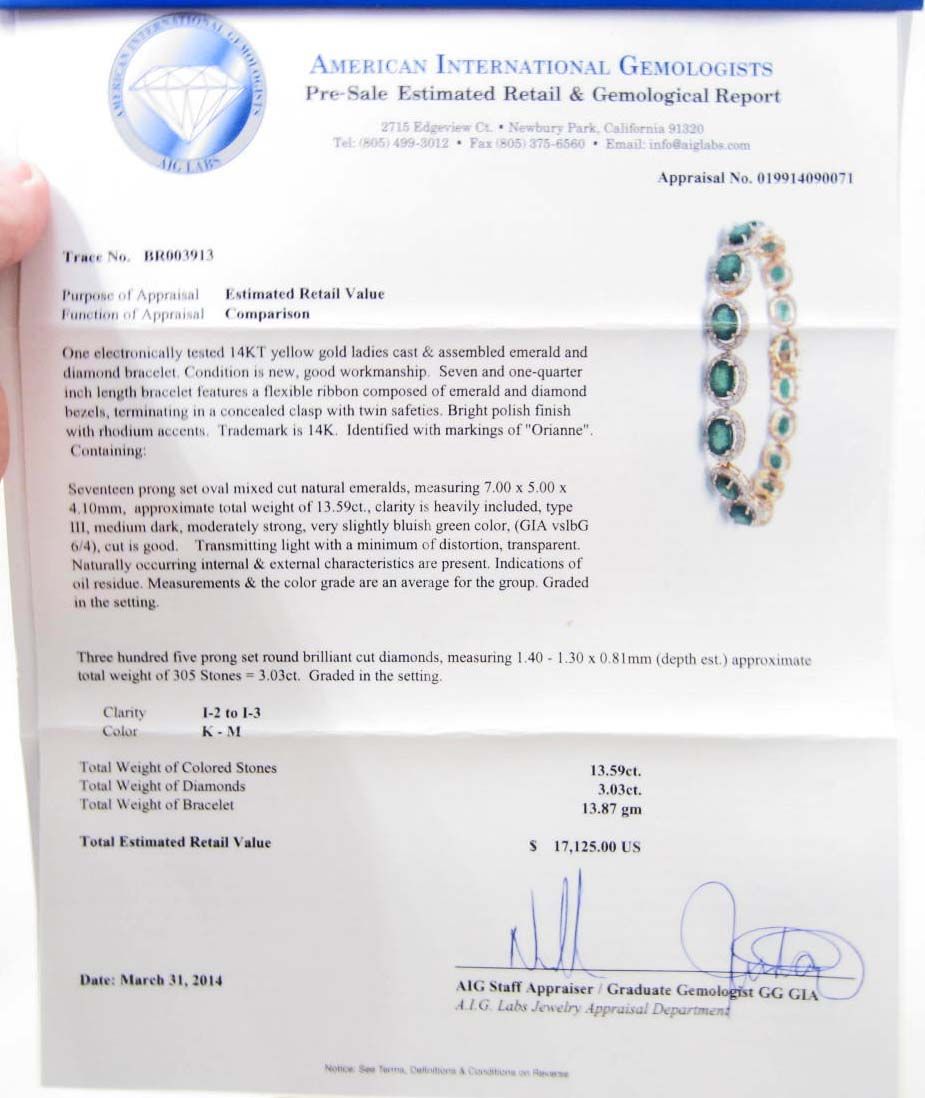 17 prong set oval mixed cut natural Emeralds 13.59 cts. 305 prong set round brilliant cut Diamonds 3.03 cts. Total Weight 13.87 grams. Appraised Value $17,125.00