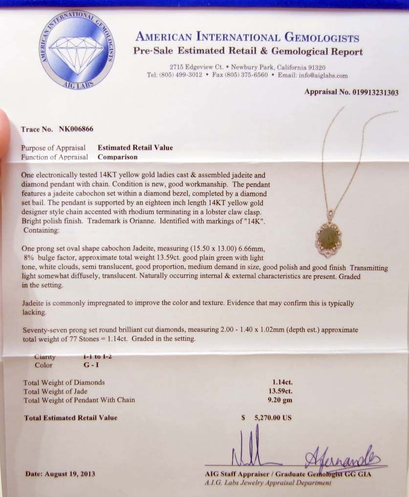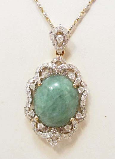 Appraisal of $5,270.00. One prong set Jadeite center stone 13.59 cts, 77 prong set round brilliant diamonds 1.14 cts, Total Weight 9.20 grams.