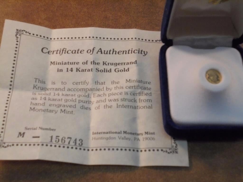 14KT. GOLD MINIATURE KRUGERRAND WITH CERTIFICATE