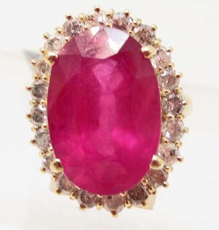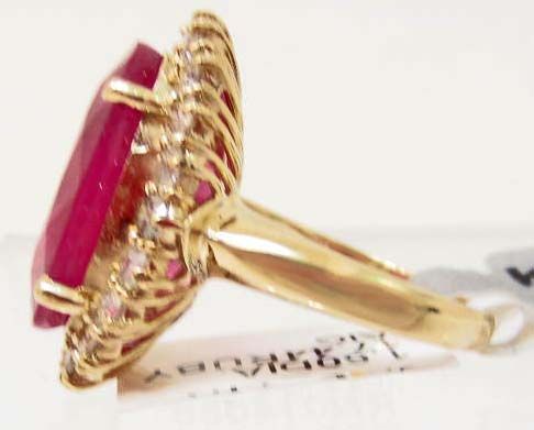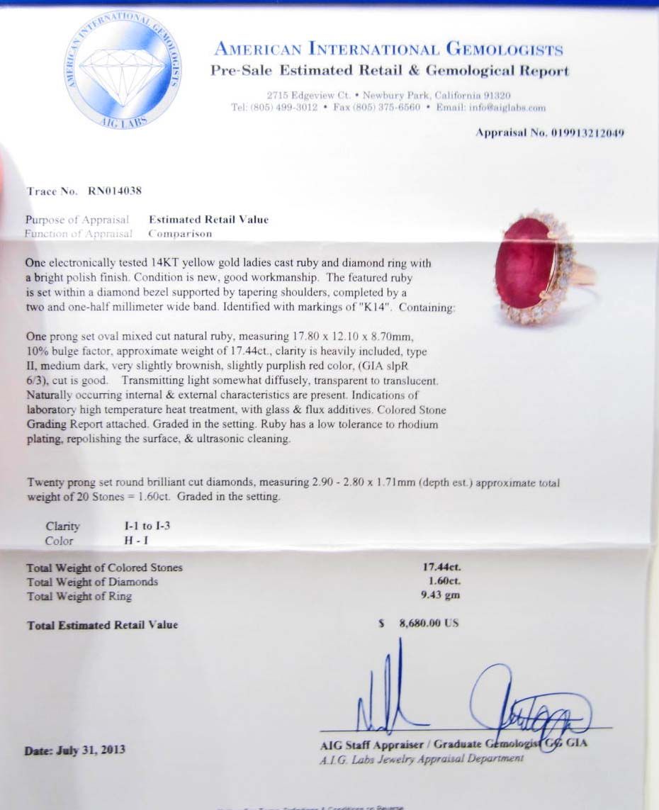 One prong set oval mixed cut Ruby center stone 17.44 cts. 20 prong set round brilliant cut Diamonds 1.60 cts. Total Weight 9.43 grams. Appraised Value $8,680.00