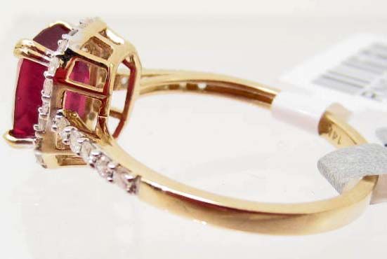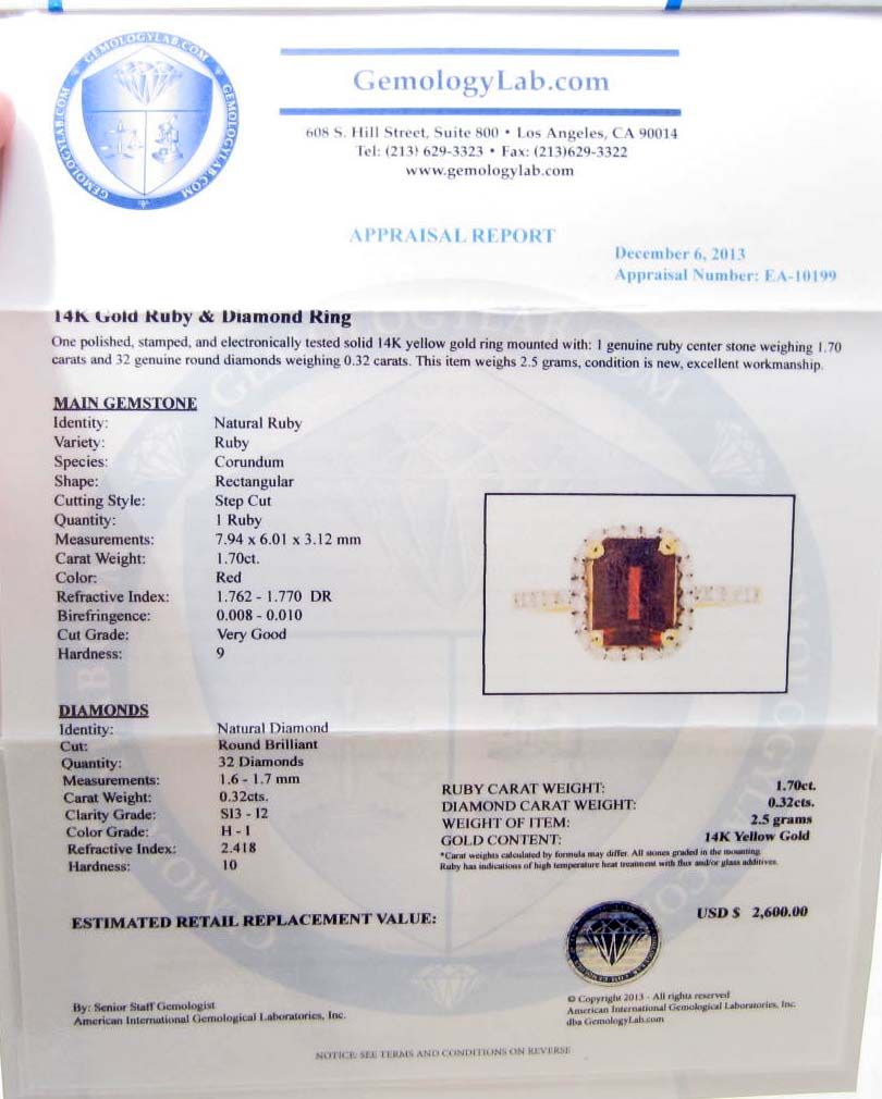 One prong set rectangular step cut Ruby center stone 1.70 cts. 32 round brilliant cut Diamonds 0.32 cts. Total Weight 2.5 grams. Appraised Value $2,600.00