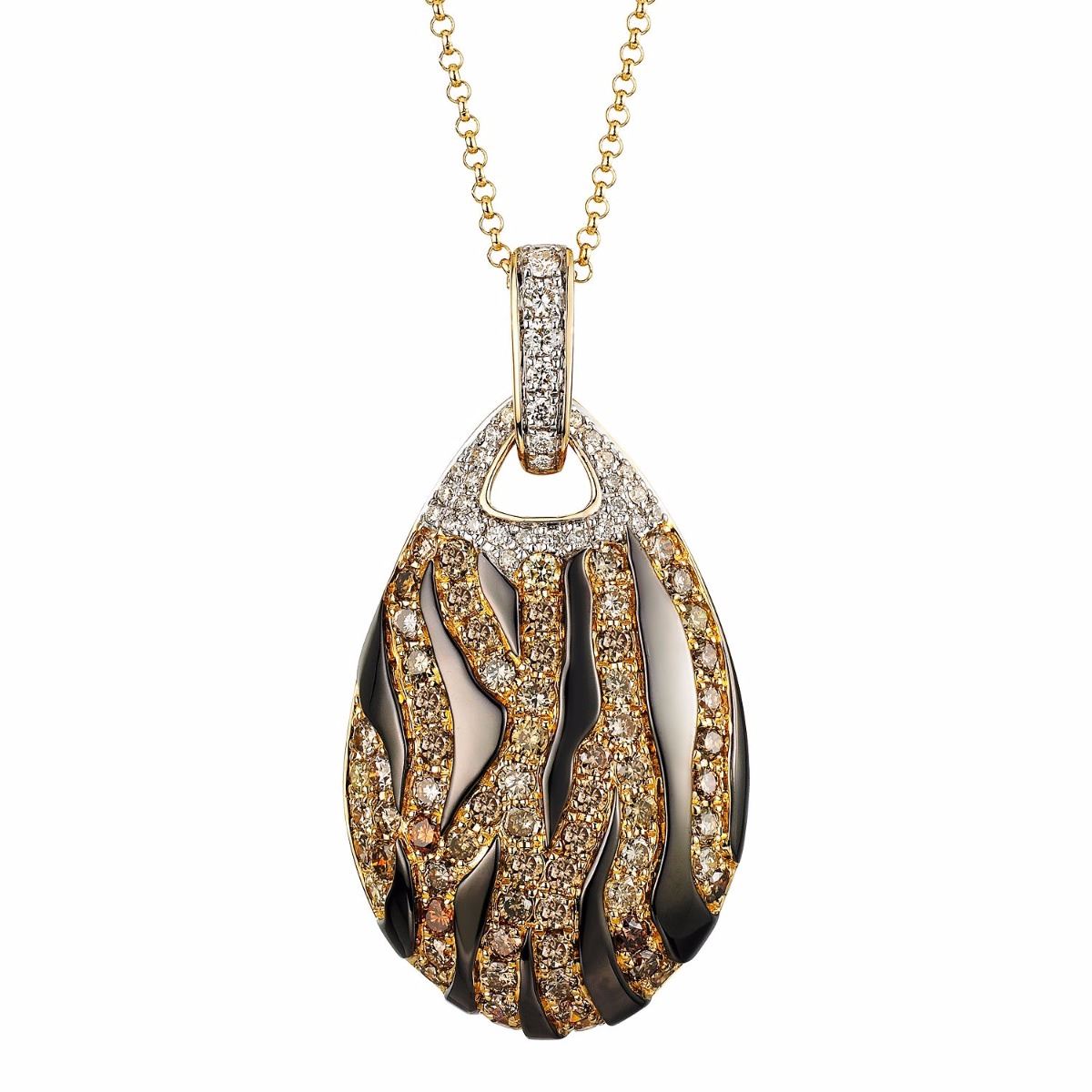 Crafted in brightly polished 14KTtwo tone gold, this pendant features round brilliant cut diamonds pave set in lines against a black antiqued background. The pendant is set on a diamond studded oblong bail, with the yellow gold rolo link chain threaded through, ready for wear.SpecificationsJewelry InformationBrand, Seller, or Collection Name: UnbrandedCategory: Pendant With ChainCategory Style: DiamondNew/Used: NewGender: FemaleLength (inches): 16"Metal: 14KT Yellow GoldTotal Weight: 6.71 GramsTotal Diamond Weight: 1.54ctwTotal Weight all Stones: 1.54ctwInternal ID:6230Diamond 1Total Carat Weight: 0.18ctwClarity: I1-I2Color: WhiteShape: RoundCut: FullCount: 34Diamond 2Total Carat Weight: 1.36ctwColor: MultiShape: RoundCut: SingleCount: 70DisclaimersThe descriptions listed should not be construed as an appraisal. The detail is provided as a guideline for color, clarity, weights and measurements to the best of our ability. We welcome inspections. WE SHIP WORLDWIDE!This item has a Reserve established by our consigner.