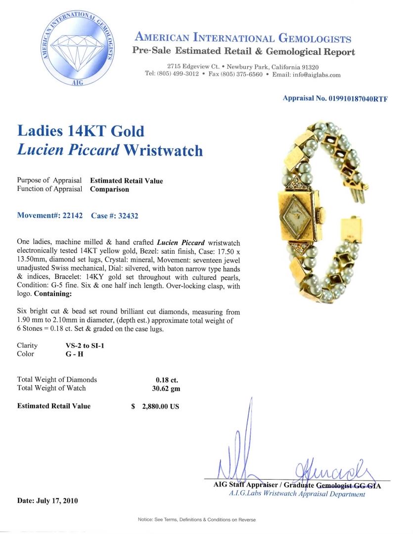 One ladies, machine milled & hand crafted Lucien Piccard wristwatch electronically tested 14KT yellow gold. Condition: G-5 Fine. Six and one half inch length. Six bright cut and bead set round brilliant cut diamonds, approx. weight of 0.18ct. Total weight of watch 30.62 gm. AIG Appraised at $2,880.00.