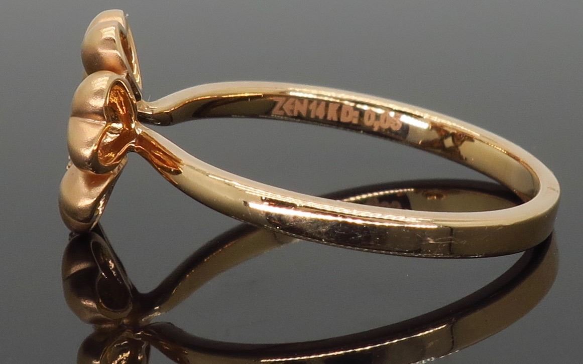 One 14KT Rose Gold 0.05ctw Diamond Ring. Round Diamonds with a total weight of 0.05cts with a color of G-I and clarity of SI-2 to I-1. Total weight of this ring is 2.4 grams. Ring size is 6.5.