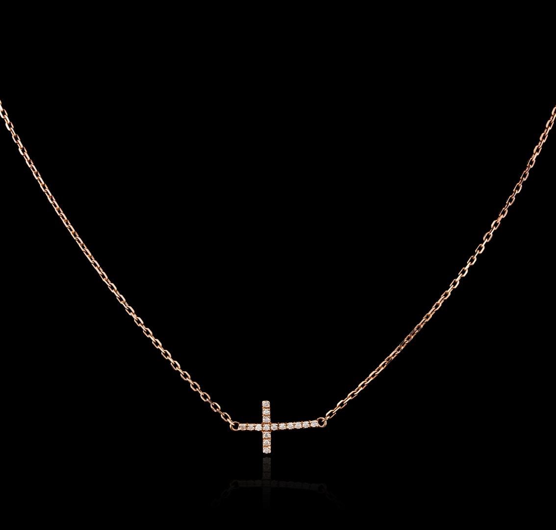 One sideways cross pendant with chain featuring: 14KT rose gold weighing 2.60 grams containing diamonds with a total weight of 0.09ct.