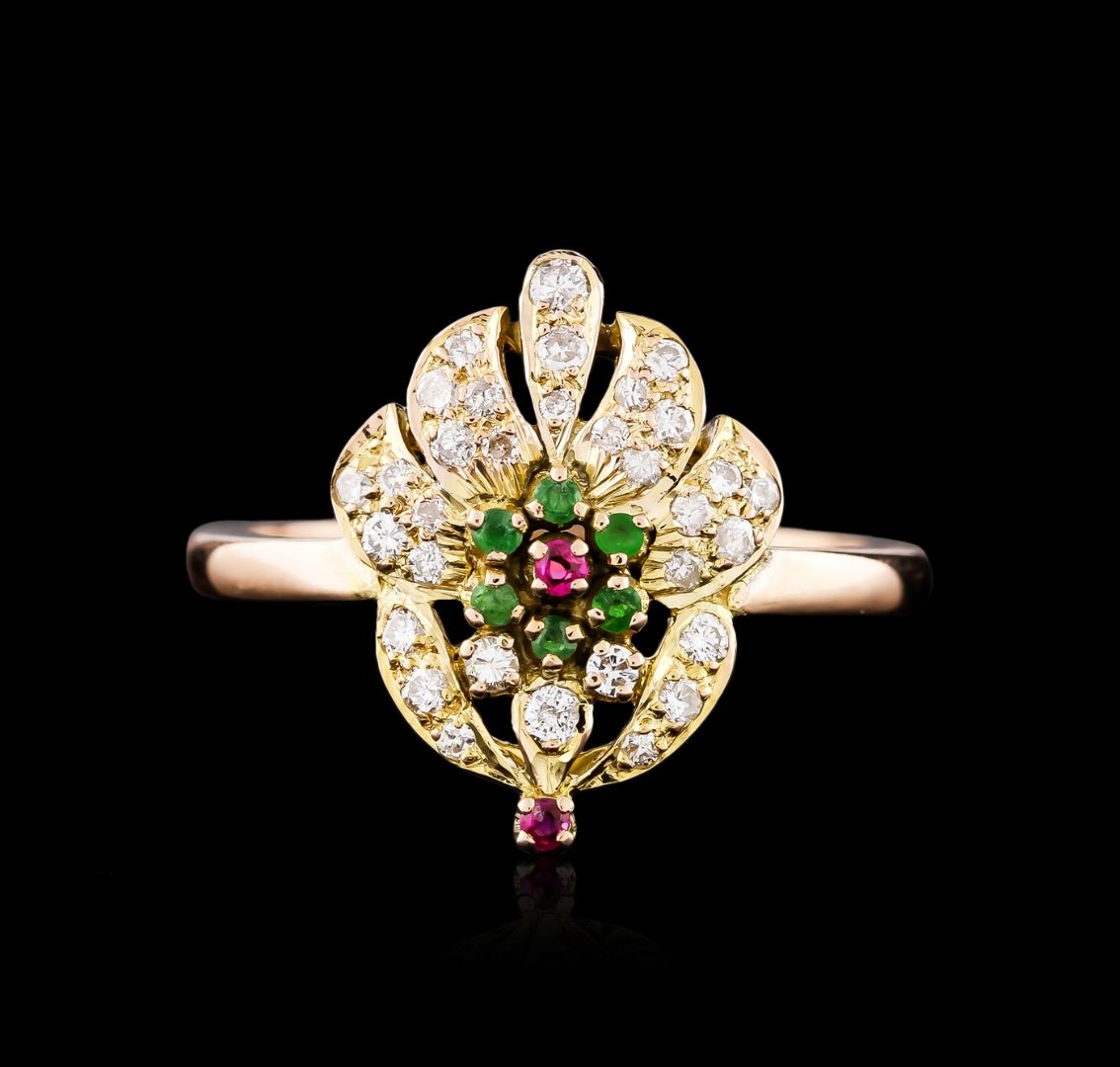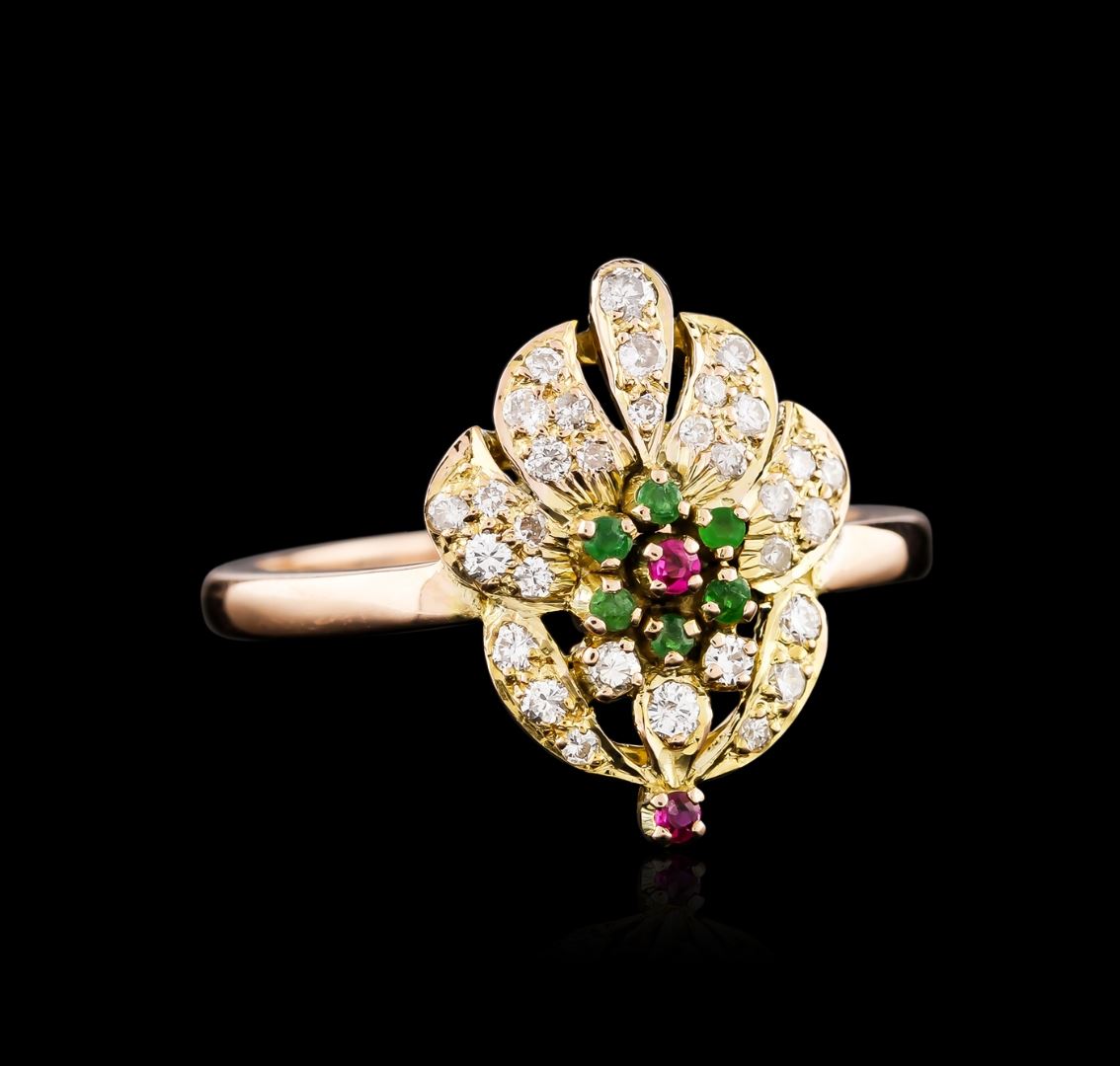 One ring featuring: 14KT rose gold weighing 4.30 grams containing emeralds with a total weight of 0.12ct, rubies with a total weight of 0.03ct, and diamonds with a total weight of 0.35ct.
