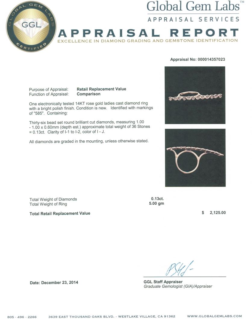 One electronically tested 14KT rose gold ladies cast diamond ring with a bright polish finish. Identified with markings of "585". Condition is new. Containing: Thirty-Six bead set round brilliant cut diamonds, measuring 1.00 - 1.00 x 0.60mm (depth est.) approximate total weight of 36 Stones = 0.13ct. Clarity: I-1 to I-2. Color: I - J. All diamonds are graded in the mounting, unless otherwise stated. Total Weight of Diamonds 0.13ct. Total Weight of Ring 5.00 grams. GGL Appraised at $2,125.00.