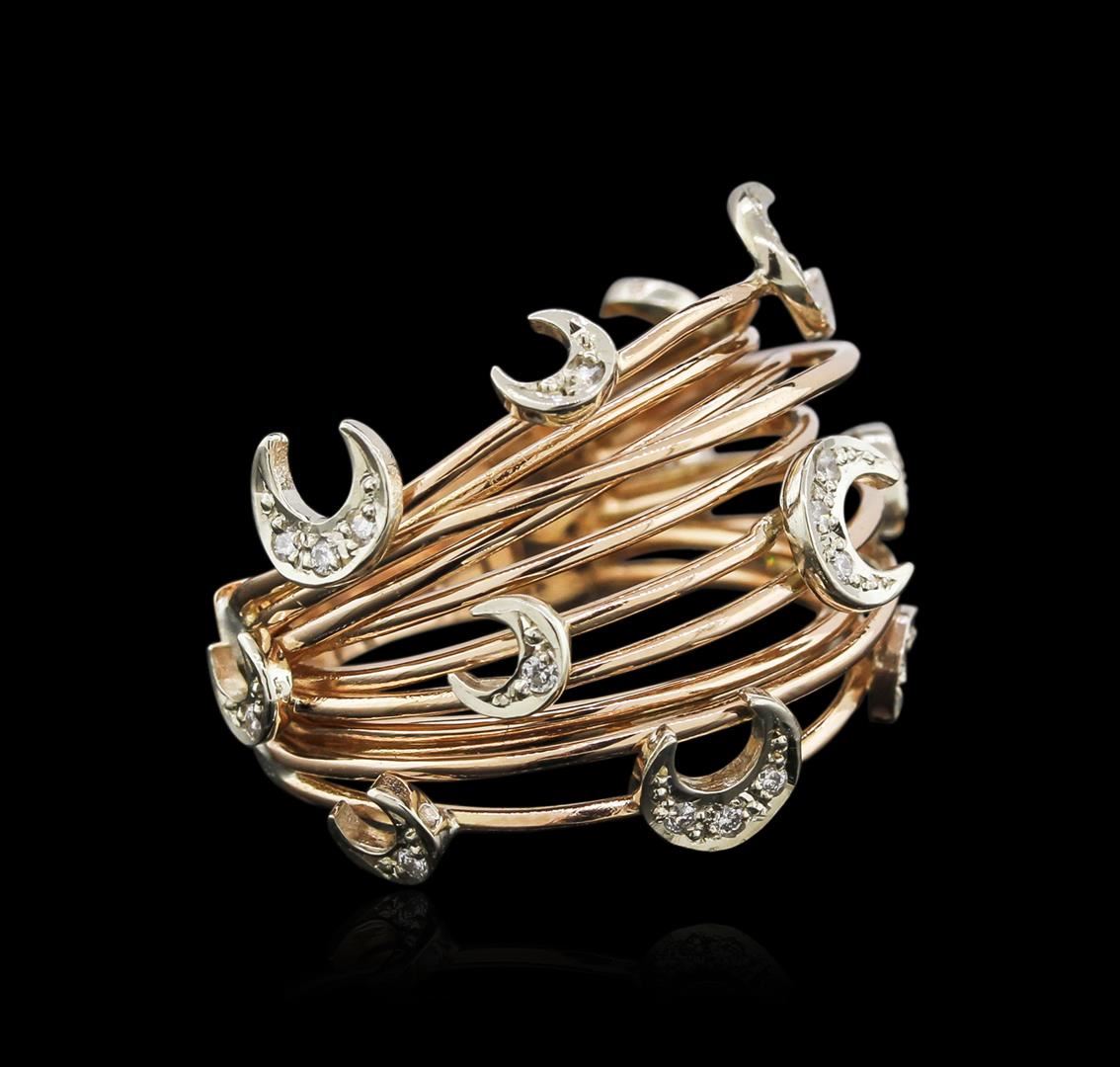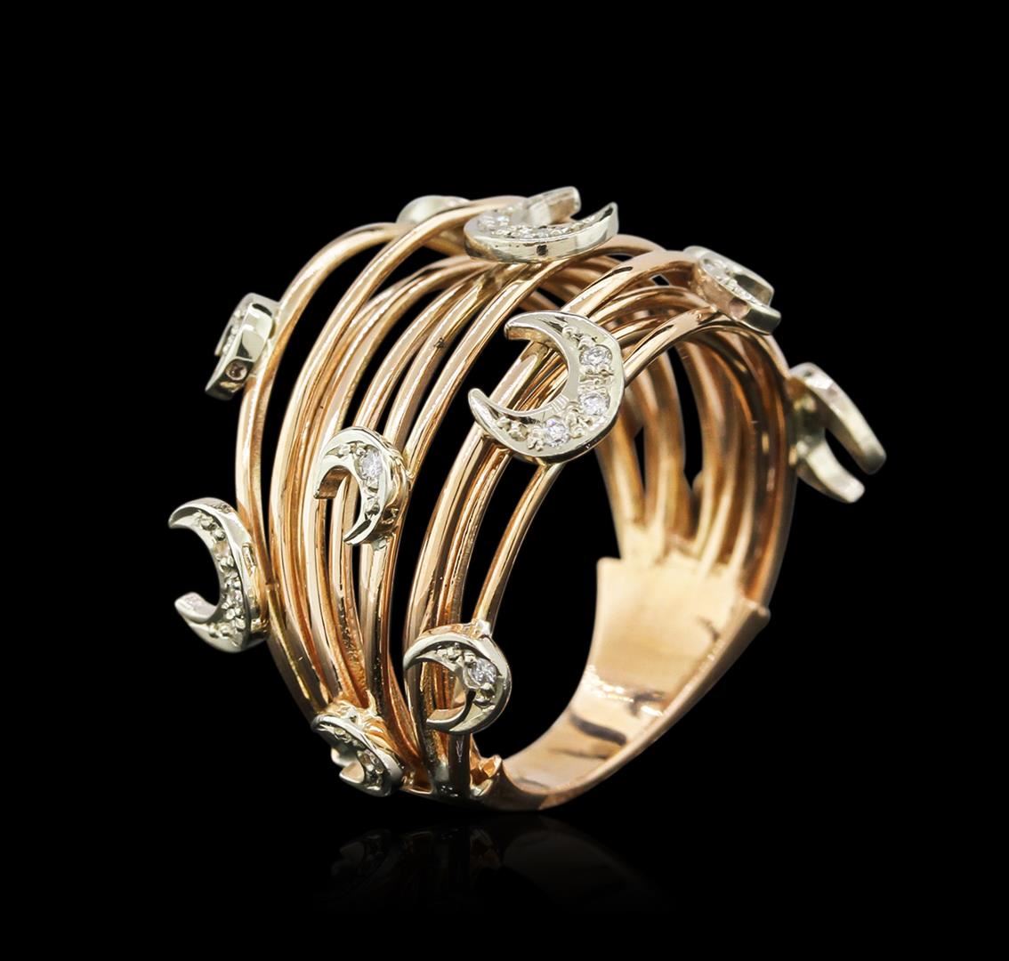 One electronically tested 14KT rose gold ladies cast diamond ring with a bright polish finish. Identified with markings of "14K". Condition is new. Containing: Twenty-Three prong set round brilliant cut diamonds, measuring 1.00 - 1.00 x 0.60mm (depth est.) approximate total weight of 23 Stones = 0.15ct. Clarity: SI-1 to I-1. Color: I - J, Cut is Good. All diamonds are graded in the mounting, unless otherwise stated. Total Weight of Diamonds 0.15ct. Total Weight of Ring 6.50 grams. GGL Appraised at $1,720.00.
