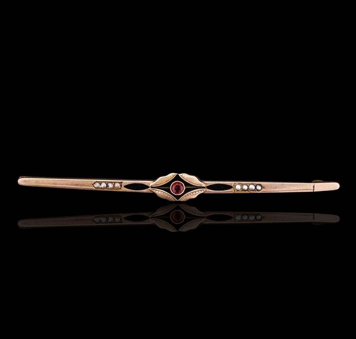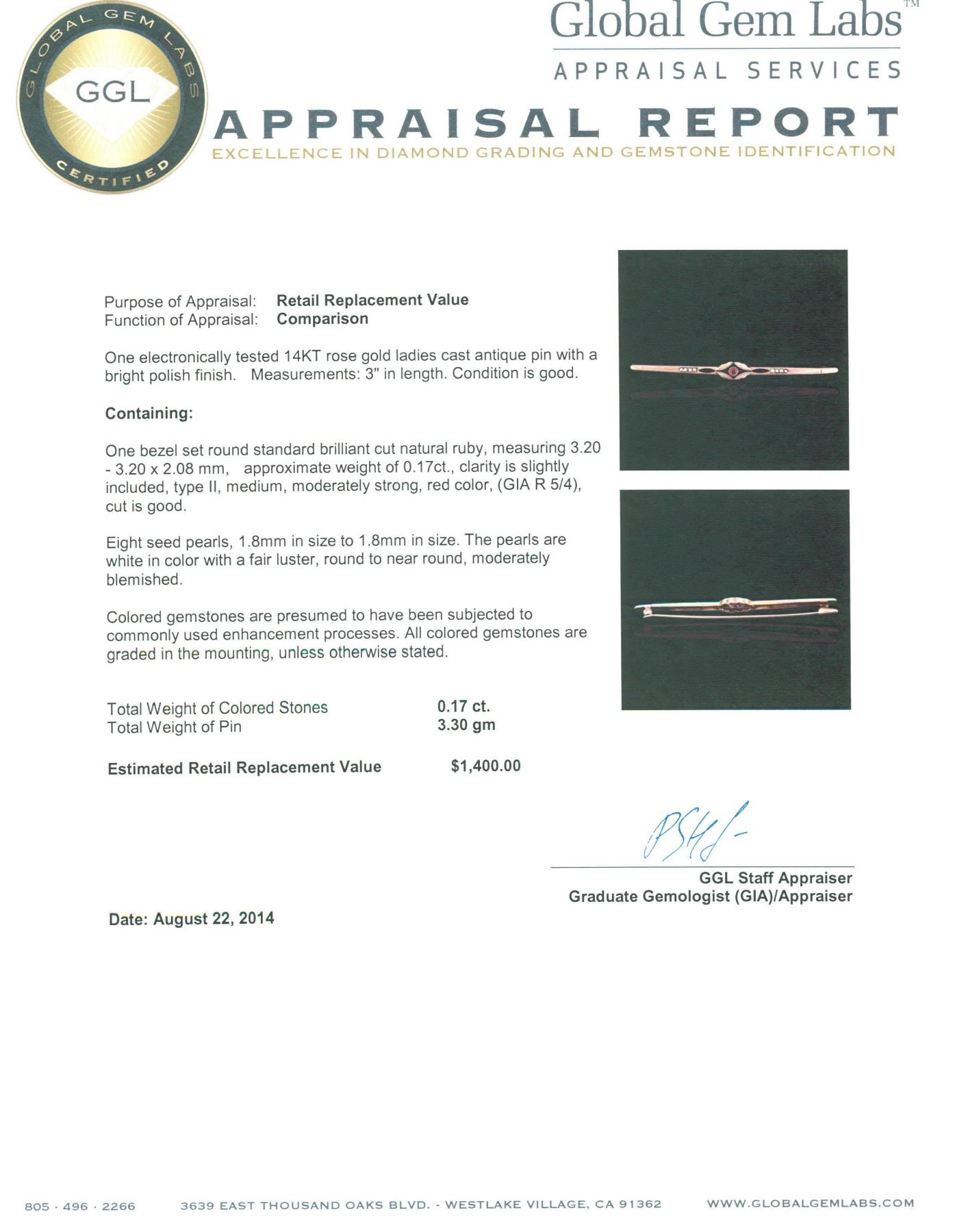 One electronically tested 14KT rose gold ladies cast antique pin with a bright polish finish. Measurements: 3" in length. Condition is good. Containing: One bezel set round standard brilliant cut natural ruby, measuring 3.20 - 3.20 x 2.08 mm, approximate weight of 0.17ct., clarity is slightly included, type II, medium, moderately strong, red color, (GIA R 5/4), cut is good. Eight seed pearls, 1.8mm in size to 1.8mm in size. The pearls are white in color with a fair luster, round to near round, moderately blemished. Colored gemstones are presumed to have been subjected to commonly used enhancement processes. All colored gemstones are graded in the mounting, unless otherwise stated. Total Weight of Colored Stones 0.17ct. Total Weight of Pin 3.30 grams. GGL Appraised.