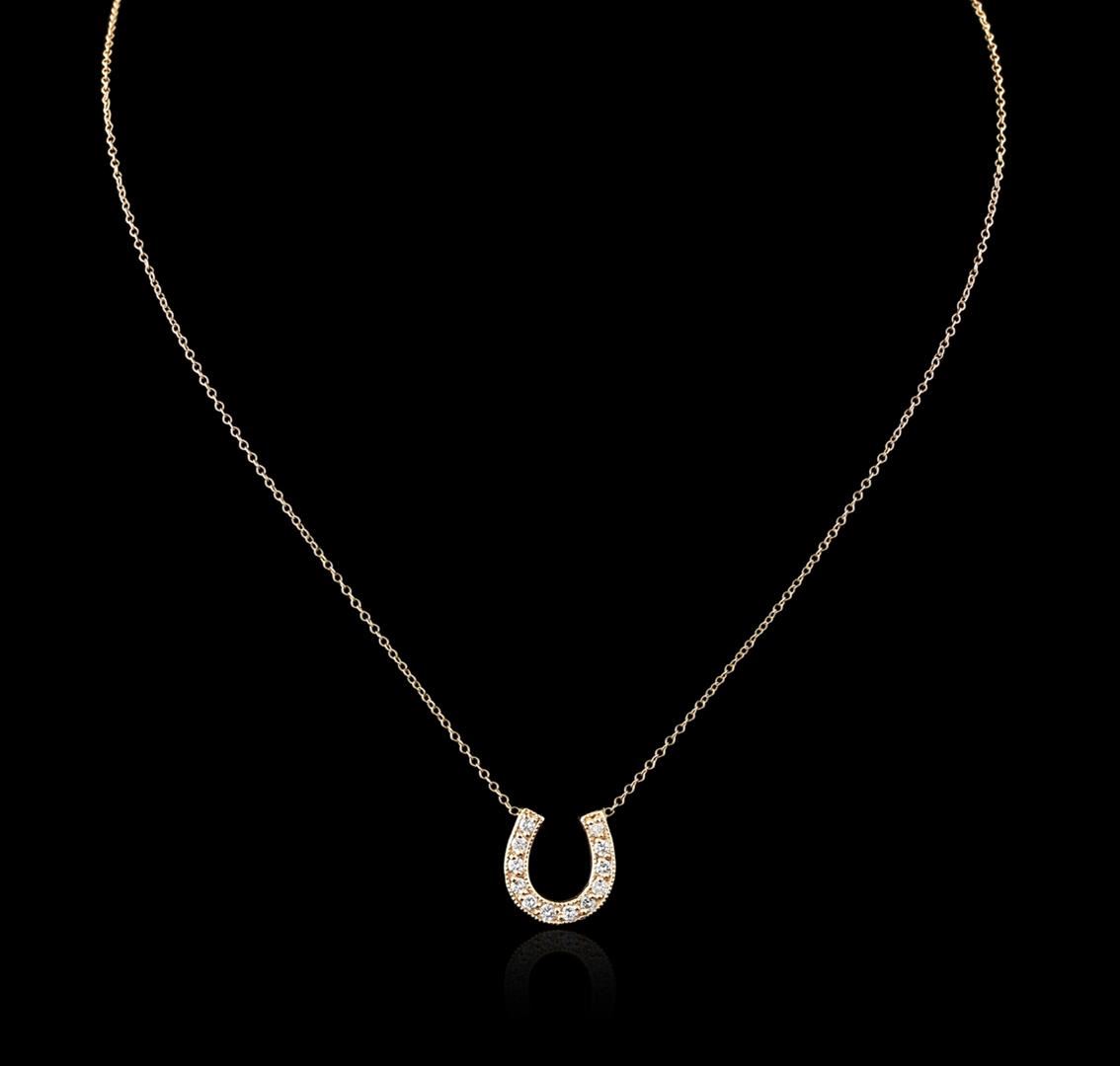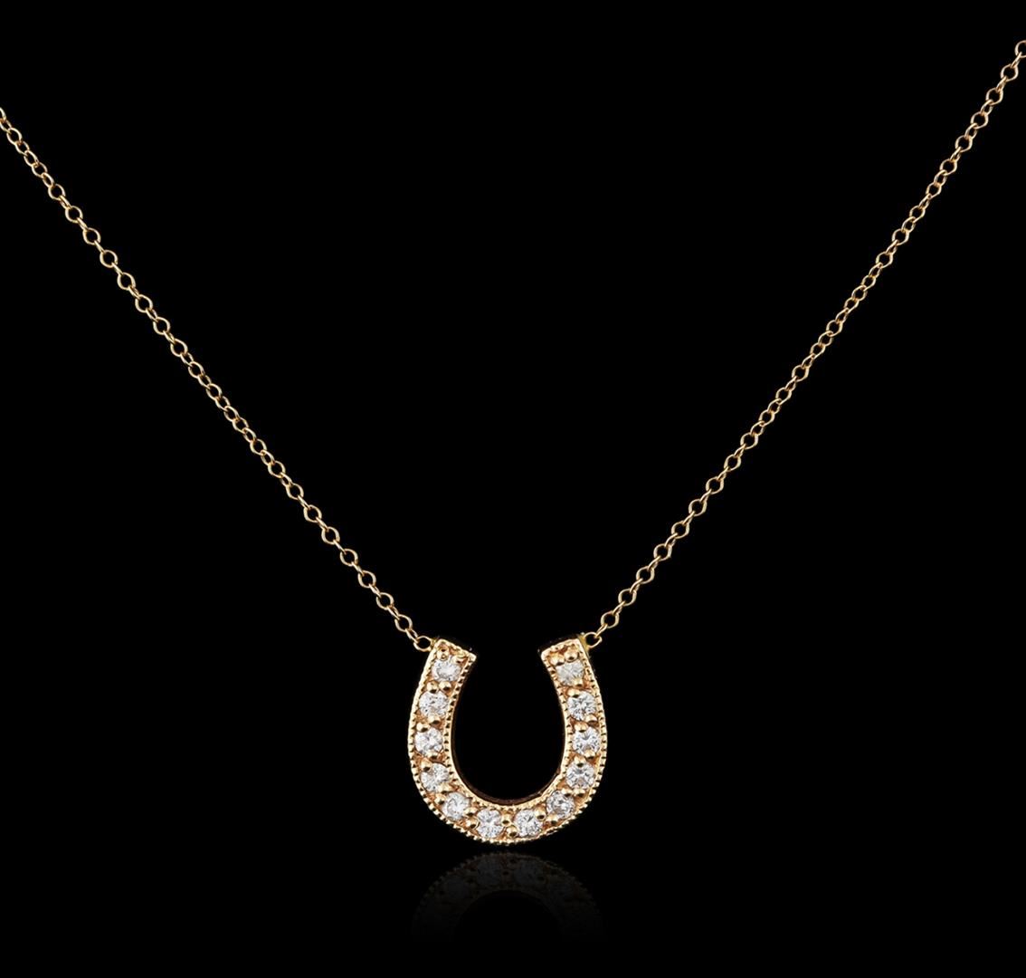 One horseshoe pendant with chain featuring: 14KT rose gold weighing 2.79 grams containing diamonds with a total weight of 0.20ct.