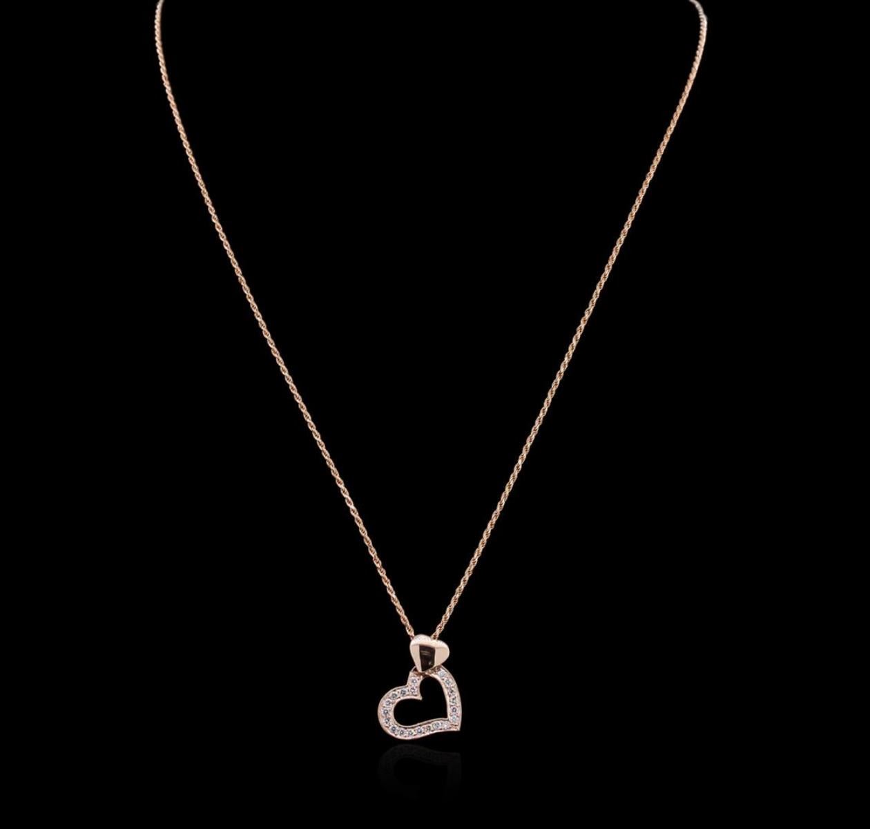 One electronically tested 14KT rose gold ladies cast diamond pendant & chain 18.0" long, with a lobster claw clasp with a bright polish finish. Identified with markings of "14K". Condition is new. Containing: Twenty-One prong set round brilliant cut diamonds, measuring 1.50 - 1.50 x 0.90mm (depth est.) approximate total weight of 21 Stones = 0.30ct. Clarity: SI-2. Color: H - I, Cut is Good. Diamonds are graded in the mounting, unless otherwise stated. Total Weight of Diamonds 0.30ct. Total Weight of Pendant & Chain 5.30 grams. GGL Appraised.