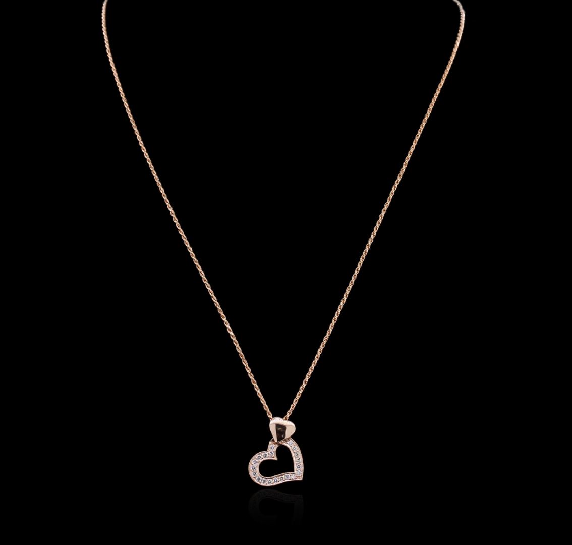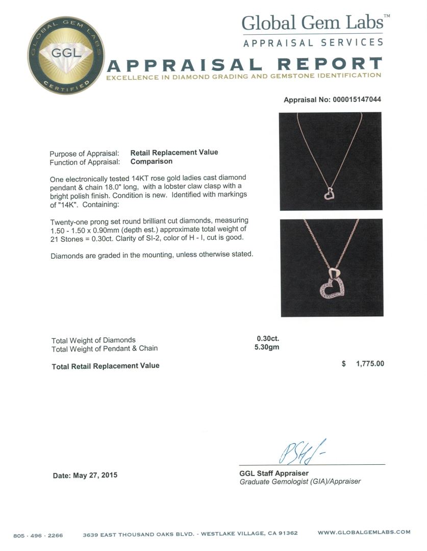 One electronically tested 14KT rose gold ladies cast diamond pendant & chain 18.0" long, with a lobster claw clasp with a bright polish finish. Identified with markings of "14K". Condition is new. Containing: Twenty-One prong set round brilliant cut diamonds, measuring 1.50 - 1.50 x 0.90mm (depth est.) approximate total weight of 21 Stones = 0.30ct. Clarity: SI-2. Color: H - I, Cut is Good. Diamonds are graded in the mounting, unless otherwise stated. Total Weight of Diamonds 0.30ct. Total Weight of Pendant & Chain 5.30 grams. GGL Appraised at $1,775.00.