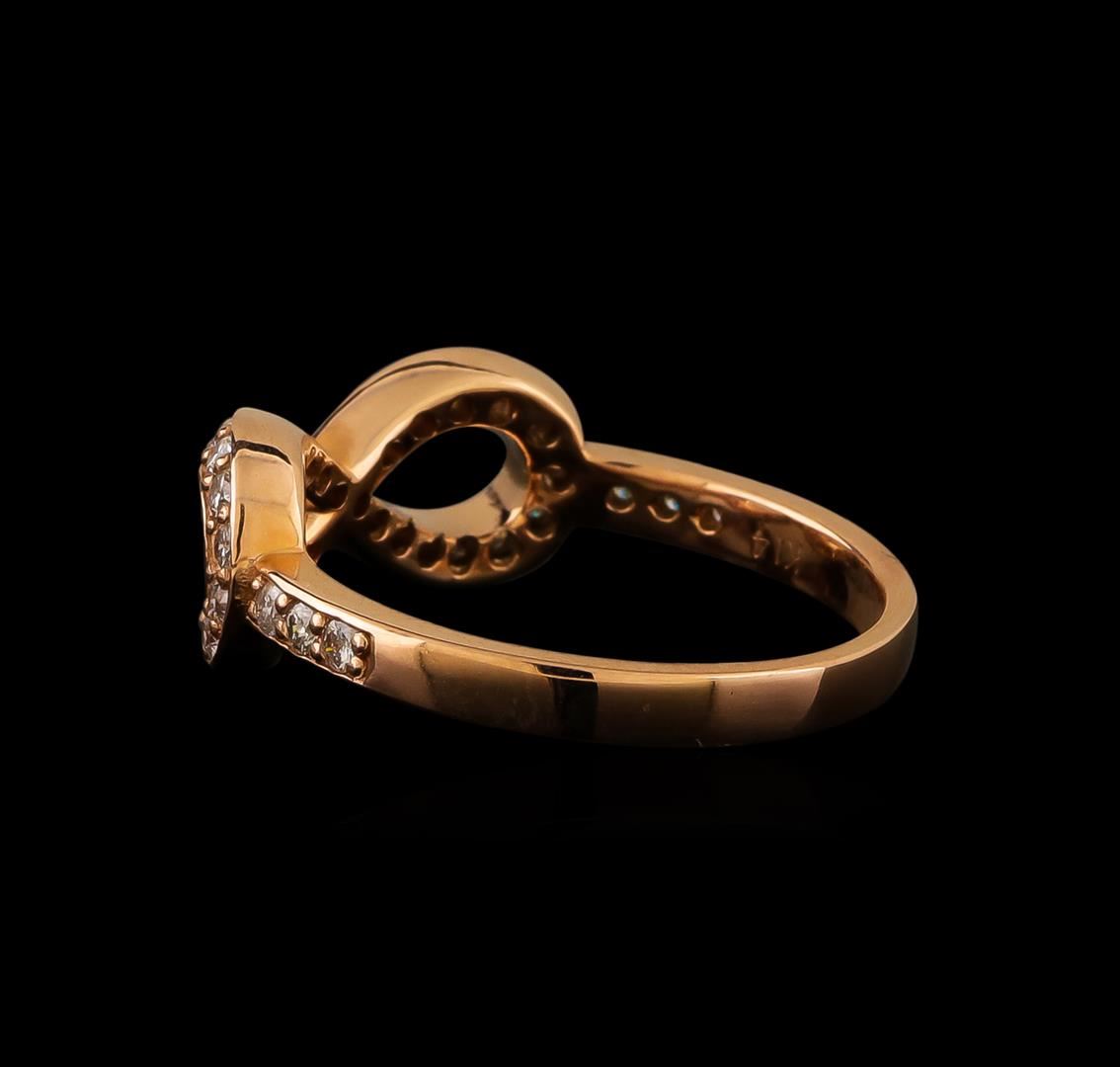 One electronically tested 14KT rose gold ladies cast diamond ring with a bright polish finish. Identified with markings of "K14". Condition is new. Containing: Thirty prong set round brilliant cut diamonds, measuring 1.50 - 1.50 x 0.90mm (depth est.) approximate total weight of 30 Stones = 0.37ct. Clarity: SI-2 to I-1. Color: I - J, Cut is Good. All diamonds are graded in the mounting, unless otherwise stated. Total Weight of Diamonds 0.37ct. Total Weight of Ring 3.40 grams. GGL Appraised.