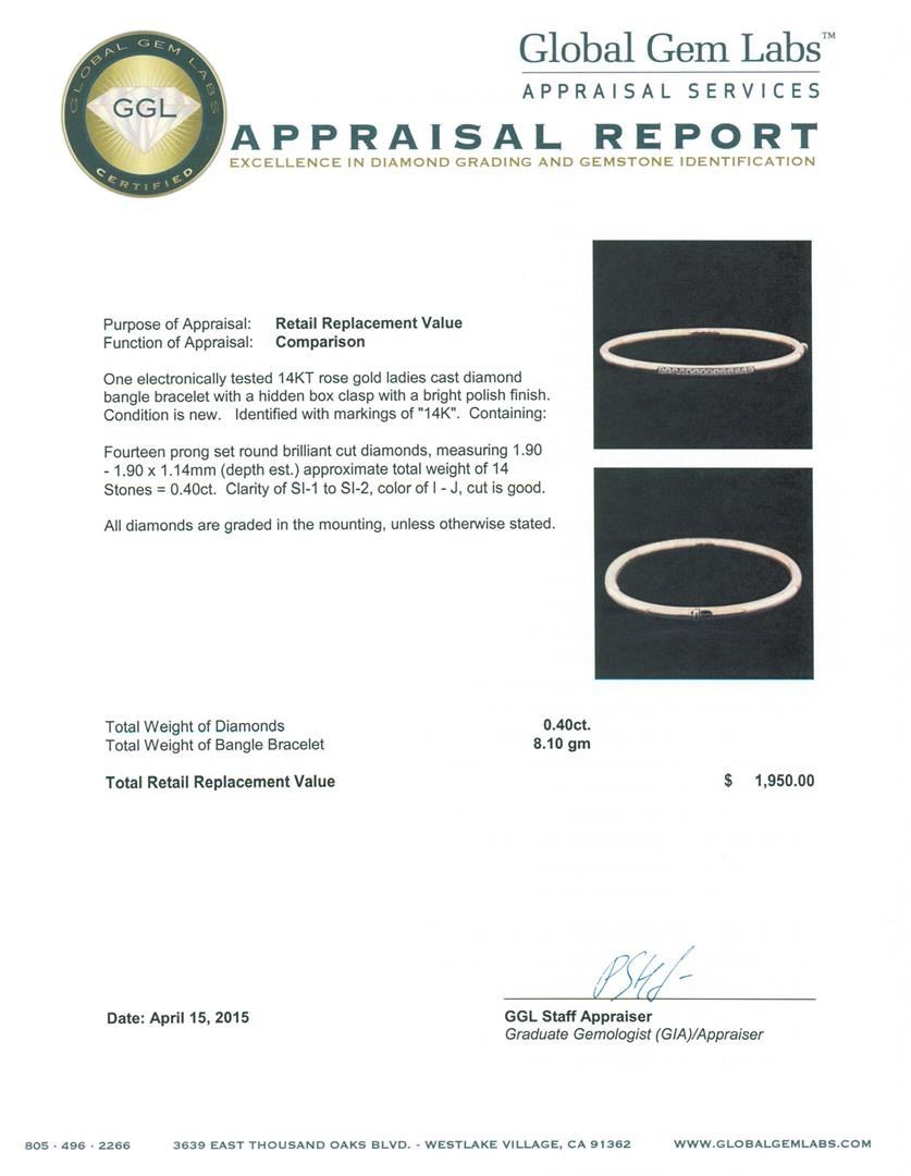 One electronically tested 14KT rose gold ladies cast diamond bangle bracelet with a hidden box clasp with a bright polish finish. Identified with markings of "14K". Condition is new. Containing: Fourteen prong set round brilliant cut diamonds, measuring 1.90 - 1.90 x 1.14mm (depth est.) approximate total weight of 14 Stones = 0.40ct. Clarity: SI-1 to SI-2. Color: I - J, Cut is Good. All diamonds are graded in the mounting, unless otherwise stated. Total Weight of Diamonds 0.40ct. Total Weight of Bangle Bracelet 8.10 grams. GGL Appraised at $1,950.00.