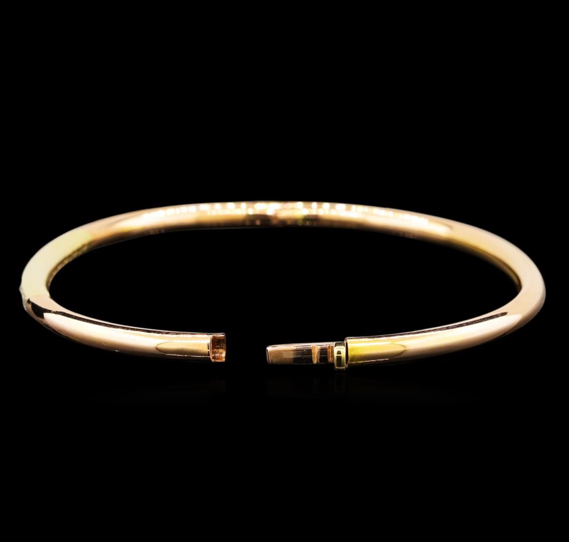 One electronically tested 14KT rose gold ladies cast diamond bangle bracelet with a hidden box clasp with a bright polish finish. Identified with markings of "14K". Condition is new. Containing: Fourteen prong set round brilliant cut diamonds, measuring 1.90 - 1.90 x 1.14mm (depth est.) approximate total weight of 14 Stones = 0.40ct. Clarity: SI-1 to SI-2. Color: I - J, Cut is Good. All diamonds are graded in the mounting, unless otherwise stated. Total Weight of Diamonds 0.40ct. Total Weight of Bangle Bracelet 8.10 grams. GGL Appraised at $1,950.00.