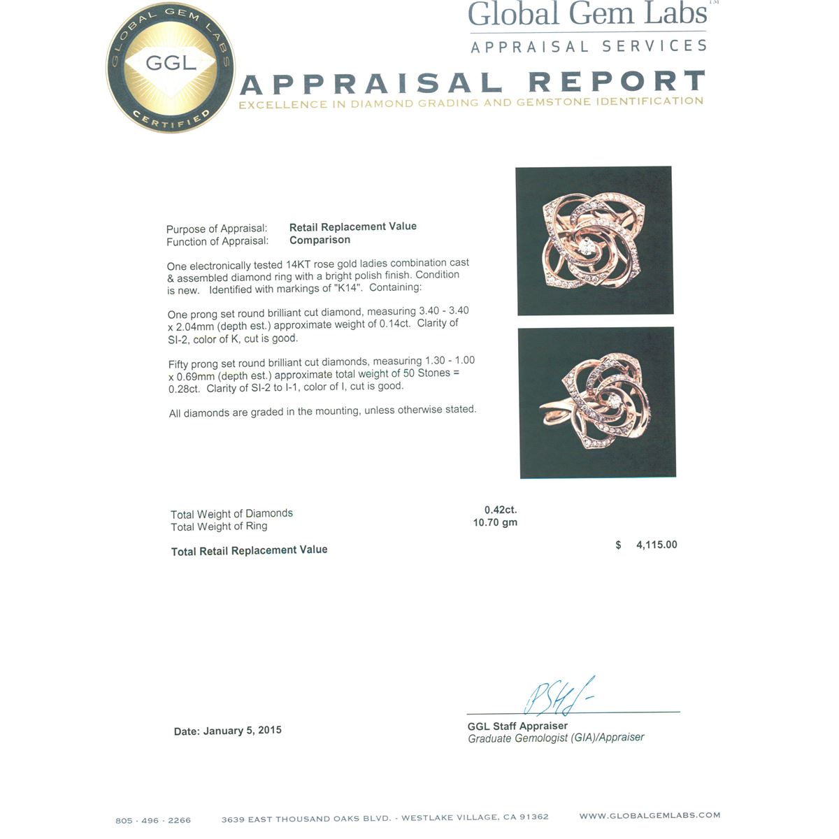 One electronically tested 14KT rose gold ladies combination cast & assembled diamond ring with a bright polish finish. Identified with markings of "K14". Condition is new. Containing: One prong set round brilliant cut diamond, measuring 3.40 - 3.40 x 2.04mm (depth est.) approximate weight of 0.14ct. Clarity: SI-2. Color: K, Cut is Good. Fifty prong set round brilliant cut diamonds, measuring 1.30 - 1.00 x 0.69mm (depth est.) approximate total weight of 50 Stones = 0.28ct. Clarity: SI-2 to I-1. Color: I, Cut is Good. All diamonds are graded in the mounting, unless otherwise stated. Total Weight of Diamonds 0.42ct. Total Weight of Ring 10.70 grams. GGL Appraised at $4,115.00.