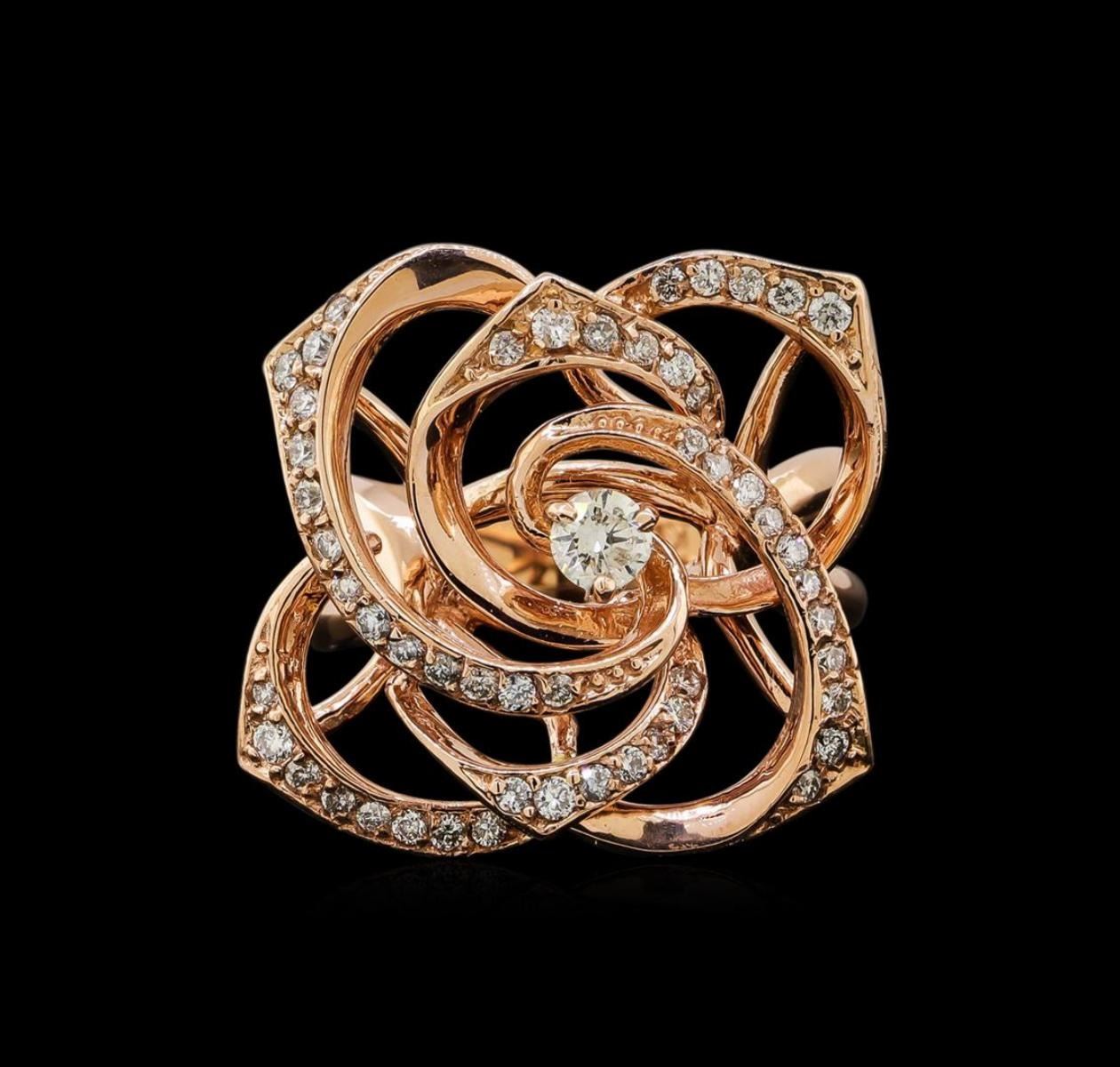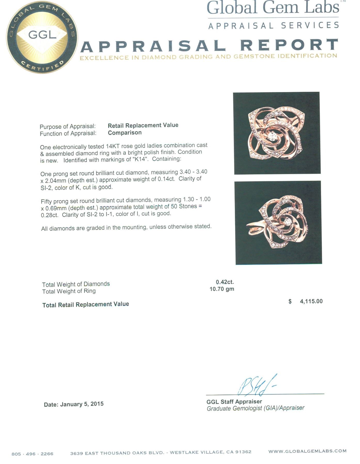 One electronically tested 14KT rose gold ladies combination cast & assembled diamond ring with a bright polish finish. Identified with markings of "K14". Condition is new. Containing: One prong set round brilliant cut diamond, measuring 3.40 - 3.40 x 2.04mm (depth est.) approximate weight of 0.14ct. Clarity: SI-2. Color: K, Cut is Good. Fifty prong set round brilliant cut diamonds, measuring 1.30 - 1.00 x 0.69mm (depth est.) approximate total weight of 50 Stones = 0.28ct. Clarity: SI-2 to I-1. Color: I, Cut is Good. All diamonds are graded in the mounting, unless otherwise stated. Total Weight of Diamonds 0.42ct. Total Weight of Ring 10.70 grams. GGL Appraised.