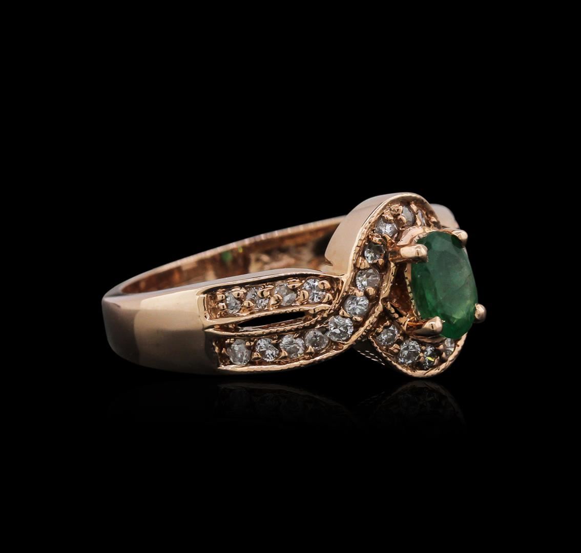 One ring featuring: 14KT rose gold weighing 5.00 grams containing one emerald center stone with a total weight of 0.42ct and 32 diamonds with a total weight of 0.33ct.