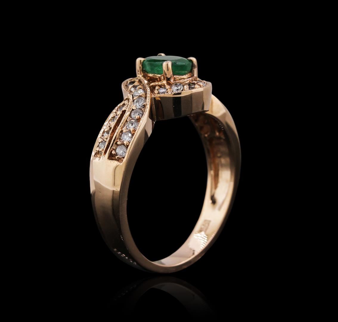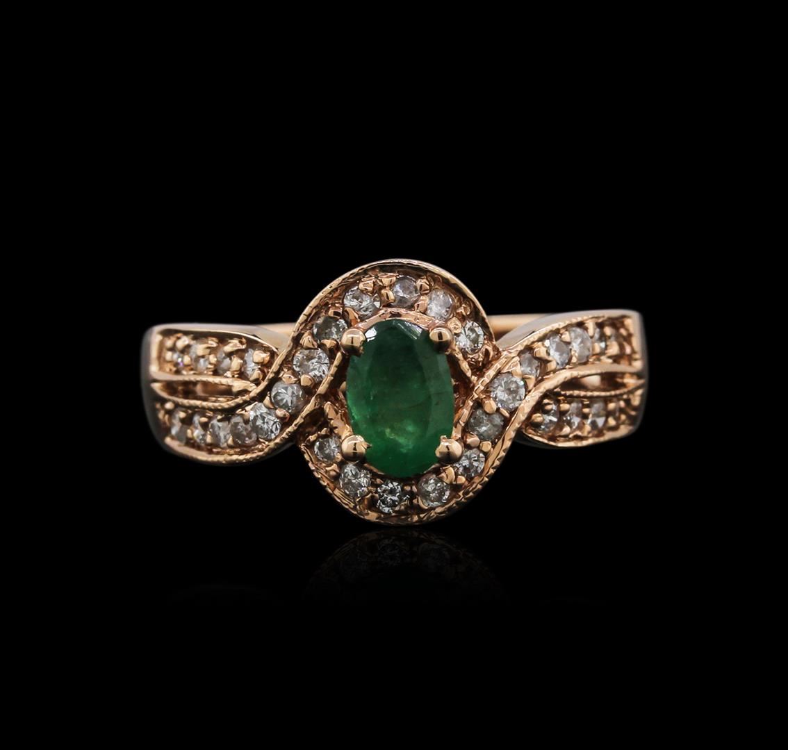 One ring featuring: 14KT rose gold weighing 5.00 grams containing one emerald center stone with a total weight of 0.42ct and 32 diamonds with a total weight of 0.33ct.