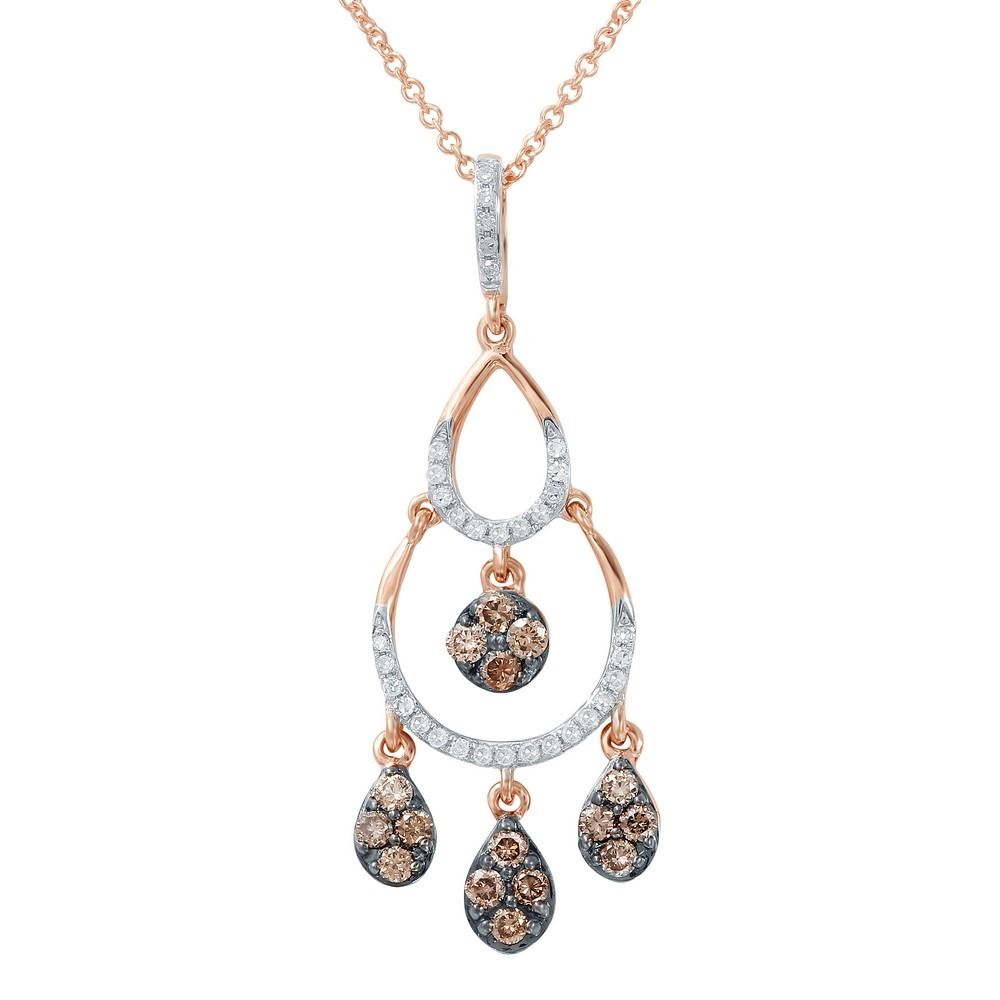 One 14KT Rose Gold 0.42ctw Diamond Pendant with Chain. (16) brown Diamonds with a total weight of 0.32cts. (33) round diamonds with a total weight of 0.10cts with a color of I and clarity of I-1. Total weight of this pendant with chain is 2.56 grams.