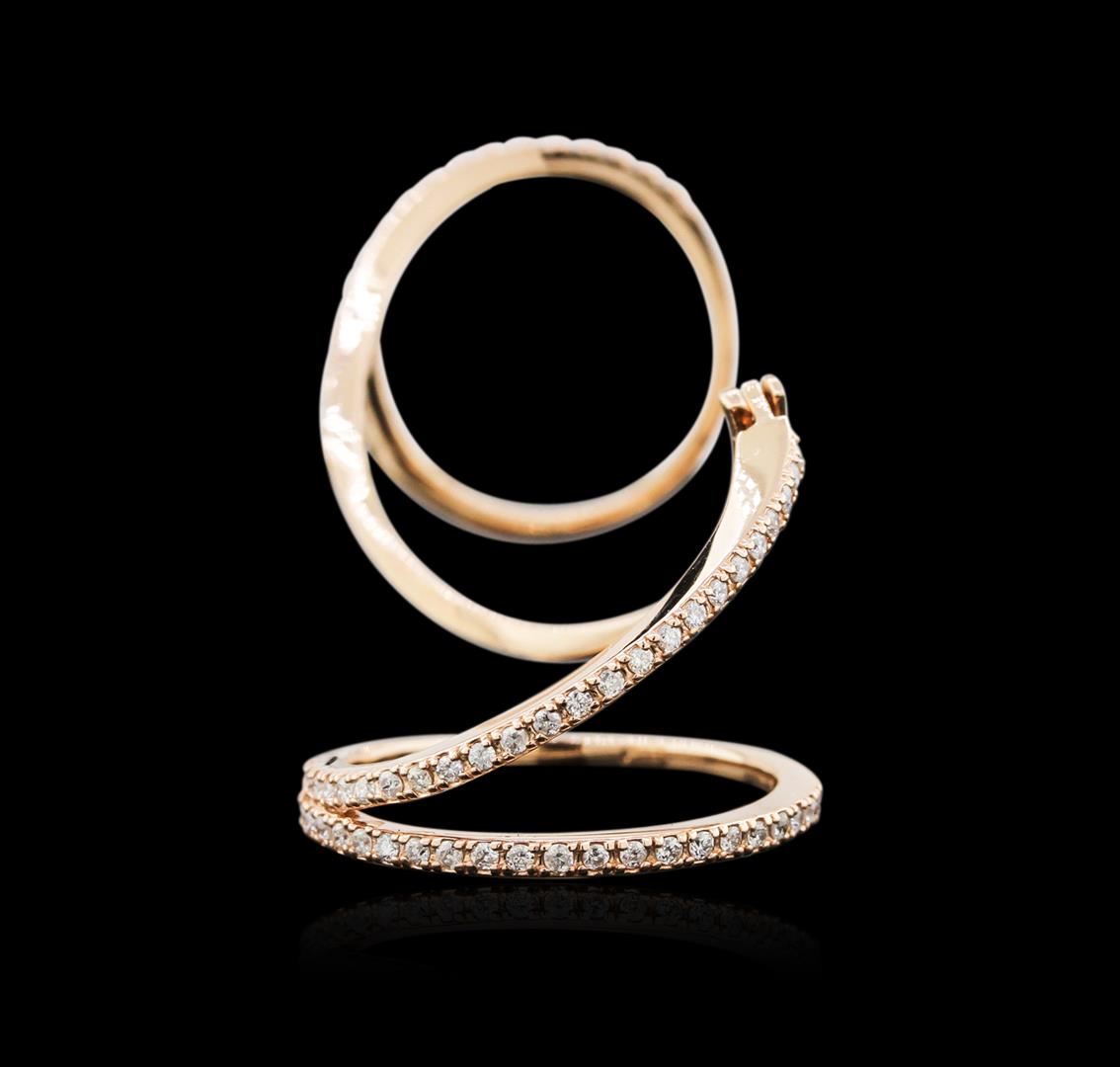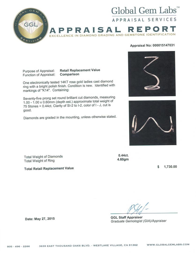 One electronically tested 14KT rose gold ladies cast diamond ring with a bright polish finish. Identified with markings of "K14". Condition is new. Containing: Seventy-Five prong set round brilliant cut diamonds, measuring 1.00 - 1.00 x 0.60mm (depth est.) approximate total weight of 75 Stones = 0.44ct. Clarity: SI-2 to I-2. Color: I - J, Cut is Good. Diamonds are graded in the mounting, unless otherwise stated. Total Weight of Diamonds 0.44ct. Total Weight of Ring 4.60 grams. GGL Appraised at $1,730.00.