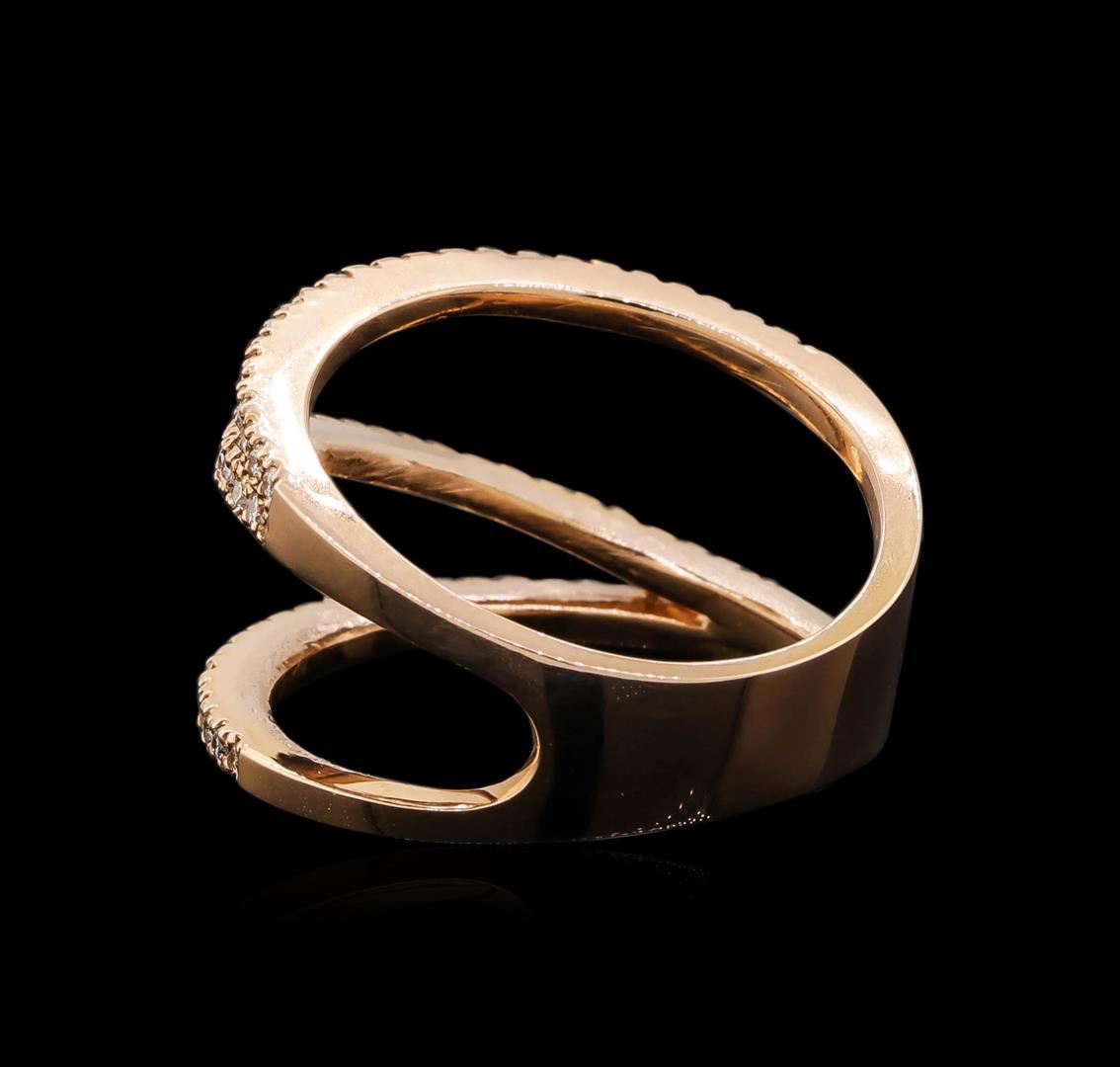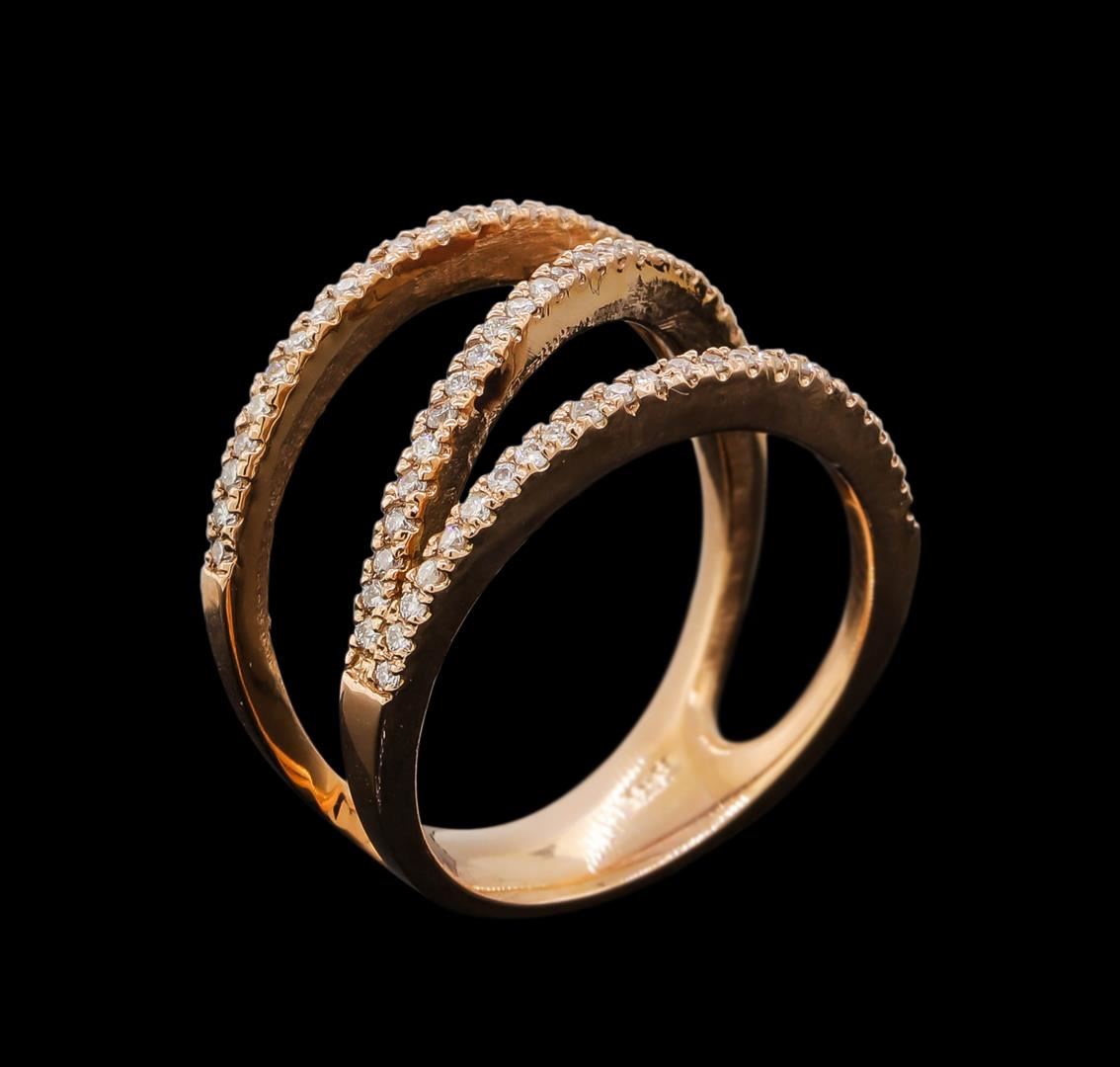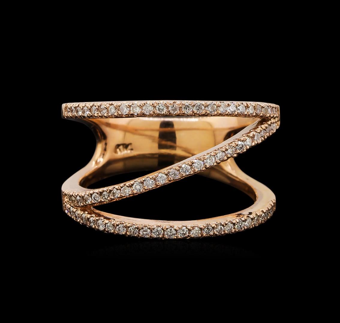 One electronically tested 14KT rose gold ladies cast diamond ring with a split shoulder shank with a bright polish finish. Identified with markings of "14K". Condition is new. Containing: Seventy-Four prong set round brilliant cut diamonds, measuring 1.10 - 1.10 x 0.66mm (depth est.) approximate total weight of 74 Stones = 0.45ct. Clarity: I-1 to I-2. Color: J - K, Cut is Good. Diamonds are graded in the mounting, unless otherwise stated. Total Weight of Diamonds 0.45ct. Total Weight of Ring 5.90 grams. GGL Appraised at $1,870.00.