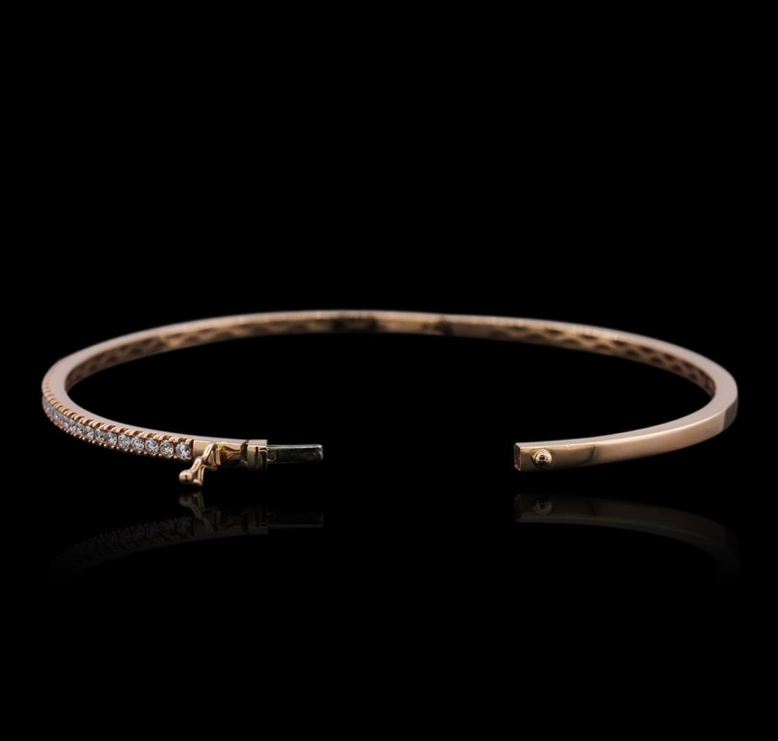 One electronically tested 14KT rose gold ladies cast diamond bangle bracelet with a hidden box clasp with safety closer with a bright polish finish. Condition is new. Containing: Forty-Six prong set round brilliant cut diamonds, measuring 1.40 - 1.40 x 0.84mm (depth est.) approximate total weight of 46 Stones = 0.46ct. Clarity: SI-1 to I-1. Color: I - J, Cut is Good. All diamonds are graded in the mounting, unless otherwise stated. Total Weight of Diamonds 0.46ct. Total Weight of Bangle Bracelet 6.60 grams. GGL Appraised at $2,515.00.