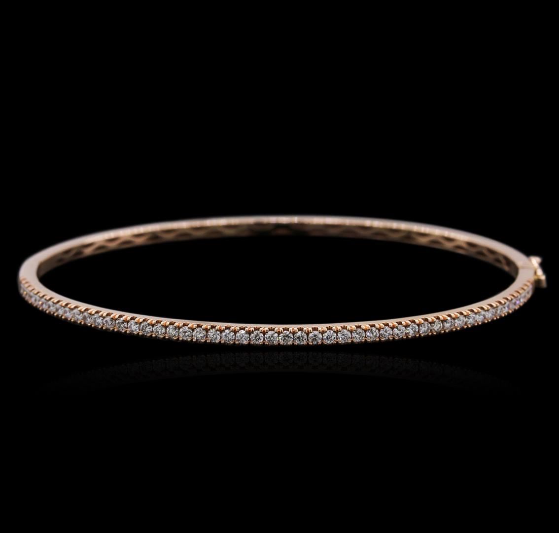 One electronically tested 14KT rose gold ladies cast diamond bangle bracelet with a hidden box clasp with safety closer with a bright polish finish. Condition is new. Containing: Forty-Six prong set round brilliant cut diamonds, measuring 1.40 - 1.40 x 0.84mm (depth est.) approximate total weight of 46 Stones = 0.46ct. Clarity: SI-1 to I-1. Color: I - J, Cut is Good. All diamonds are graded in the mounting, unless otherwise stated. Total Weight of Diamonds 0.46ct. Total Weight of Bangle Bracelet 6.60 grams. GGL Appraised.