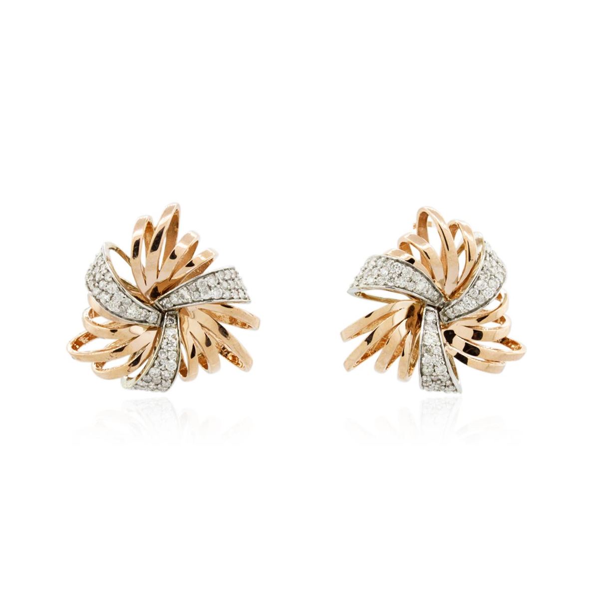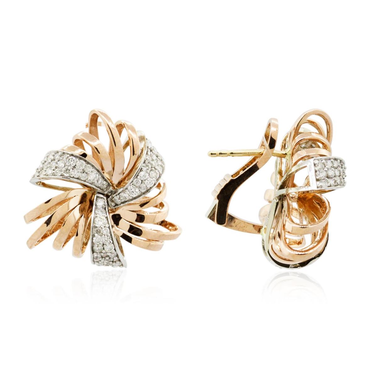 One pair electronically tested 14KT rose gold ladies combination cast & assembled earrings with Omega clip backs with posts with a bright polish finish. Condition is new. Identified with markings of "K14". Containing: Sixty-Three prong set round brilliant cut diamonds, measuring 1.30 - 1.30 x 0.78mm (depth est.) approximate. Total Weight of 63 Stones = 0.50ct. Clarity: I-1 to I-2. Color: H - I, Cut is Good. Colored gemstones are presumed to have been subjected to commonly used enhancement processes. All diamonds and colored gemstones are graded in the mounting, unless otherwise stated. Total Weight of Diamonds 0.50ct. Total Weight of Earrings 11.40 grams. GGL Appraised at $5,470.00.