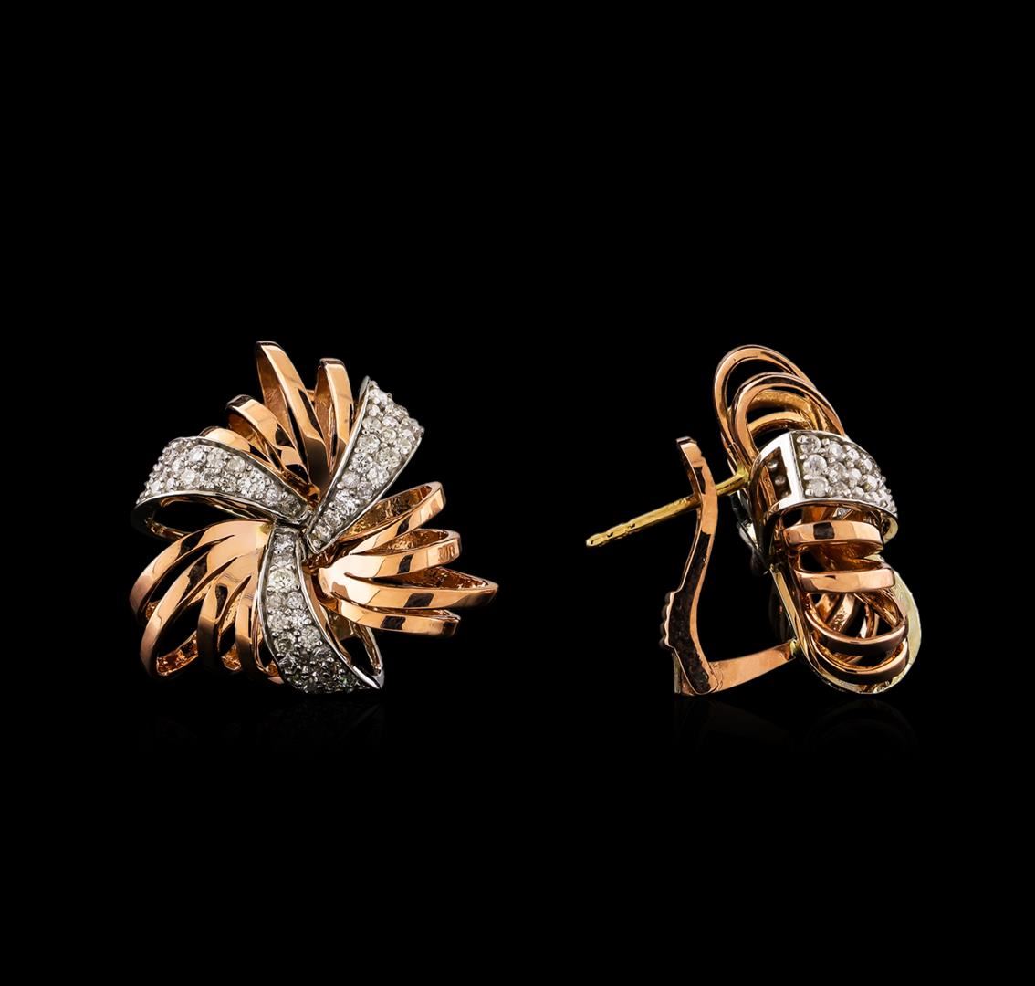 One pair electronically tested 14KT rose gold ladies combination cast & assembled earrings with Omega clip backs with posts with a bright polish finish. Condition is new. Identified with markings of "K14". Containing: Sixty-Three prong set round brilliant cut diamonds, measuring 1.30 - 1.30 x 0.78mm (depth est.) approximate. Total Weight of 63 Stones = 0.50ct. Clarity: I-1 to I-2. Color: H - I, Cut is Good. Colored gemstones are presumed to have been subjected to commonly used enhancement processes. All diamonds and colored gemstones are graded in the mounting, unless otherwise stated. Total Weight of Diamonds 0.50ct. Total Weight of Earrings 11.40 grams. GGL Appraised at $5,470.00.