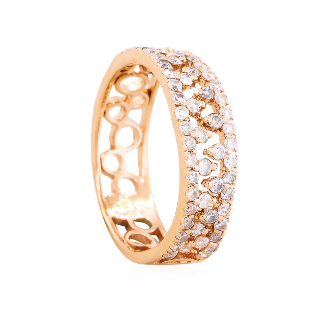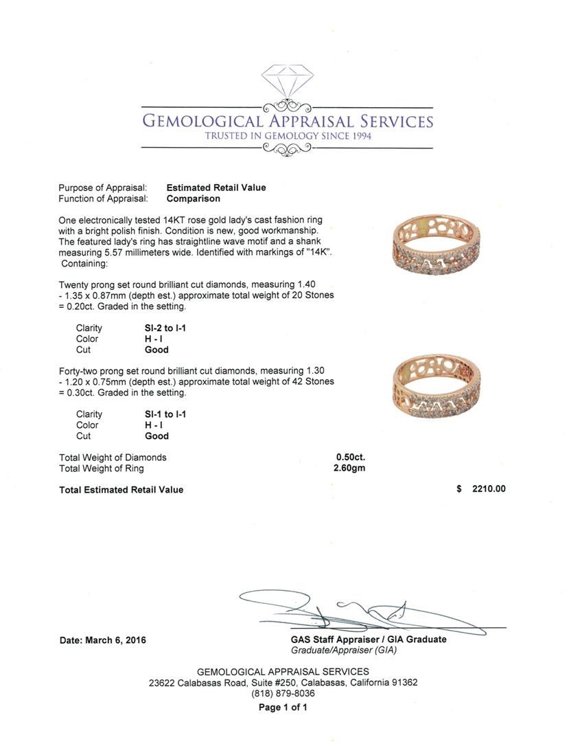 One electronically tested 14KT rose gold lady's cast fashion ring with a bright polish finish. The featured lady's ring has straight-line wave motif and a shank measuring 5.57 millimeters wide. Identified with markings of "14K". Condition is new, good workmanship. Containing: Twenty prong set round brilliant cut diamonds, measuring 1.40 - 1.35 x 0.87mm (depth est.) approximate. Total Weight of 20 Stones = 0.20ct. Graded in the setting. Clarity: SI-2 to I-1. Color: H - I, Cut Good. Forty-Two prong set round brilliant cut diamonds, measuring 1.30 - 1.20 x 0.75mm (depth est.) approximate. Total Weight of 42 Stones = 0.30ct. Graded in the setting. Clarity: SI-1 to I-1. Color: H - I, Cut Good. Total Weight of Diamonds 0.50ct. Total Weight of Ring 2.60 grams. GAS Appraised at $2,210.00.