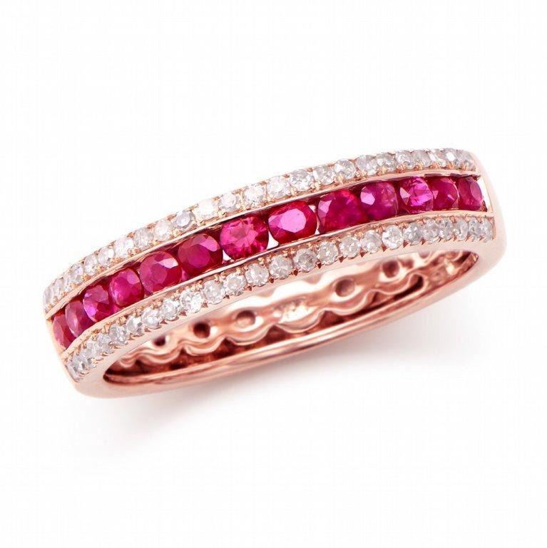 One 14KT Rose Gold 0.50ctw Ruby and Diamond Ring. (13) Rubies with a total weight of 0.50cts. (50) round Diamonds with a total weight of 0.20cts with a color of H-I and clarity of I-2. Total weight of this ring is 4.0 grams. Ring size is 7.5.